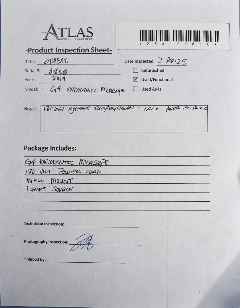 The Global was inspected for structural integrity, functionality, and condition. The frame is sturdy with no visible cracks or damage. All eletronic controls, including the preset positions and safety switches, function properly. Checked lenses for scratches and magnification. All Knobs functional, with no scratching or noise. The unit has been cleaned and disinfected. Inspection Resuly: - Ready for Resale.