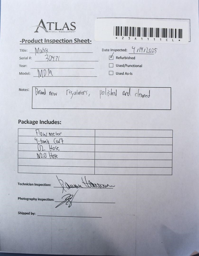 Your purchase will NOT include: N/A - other accessories not shown or listed here.The Matrx MDM Digital was refurbished by installing new regulators and polishing and cleaning each surface. O2 and N2O flow through the regulator, block, and flowmeter without any leaks. The flowmeter is accurate and in good condition overall. The screws in the block couldn't be pushed through fully, making the block potentially less secure. Refurbishment Successful