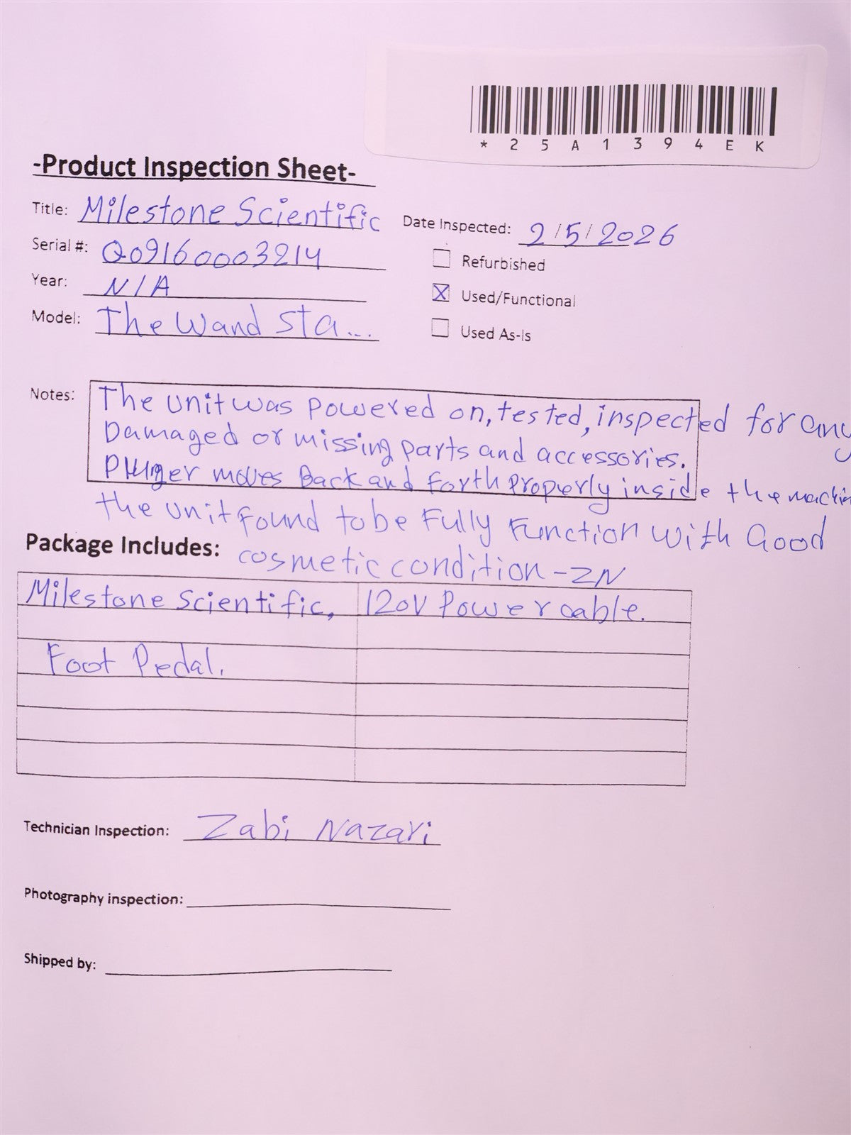 The unit was powered on, tested and visually inspected for any damaged or missing parts and accessories. plunger moves back and forth inside the machine. The unit found to be fully functional with good cosmetic condition-ZN