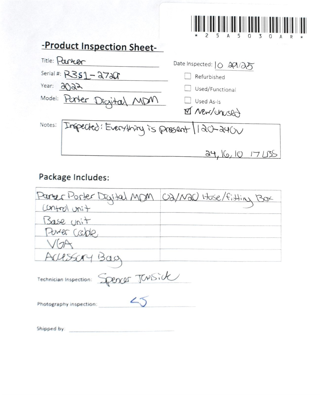 Parker/Porter Digital MDM, Base unit, Control Unit, VGA cable, Accessory Bag, O2/N20 Hose and Fitting Box