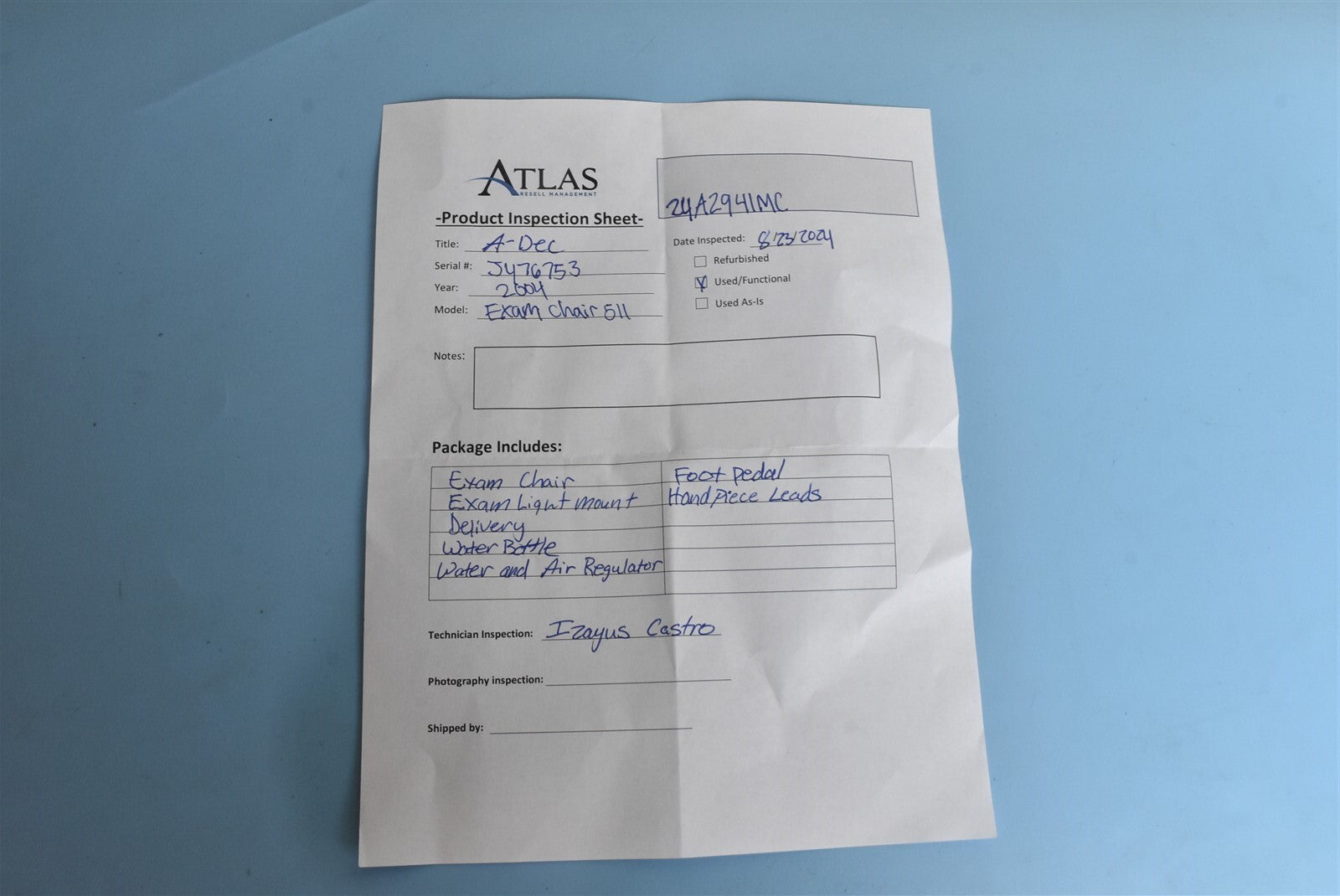 Exam Chair Exam Light Mount Delivery Water and Air Regulator Water Bottle Foot Pedal Handpiece Lead