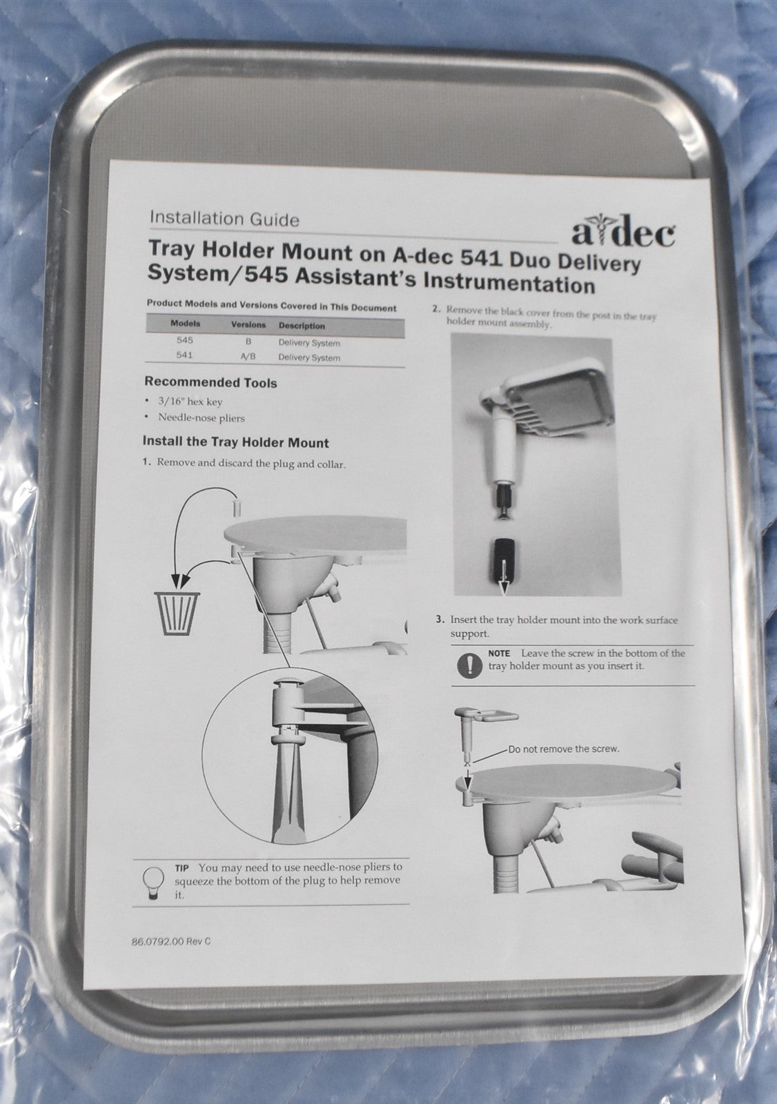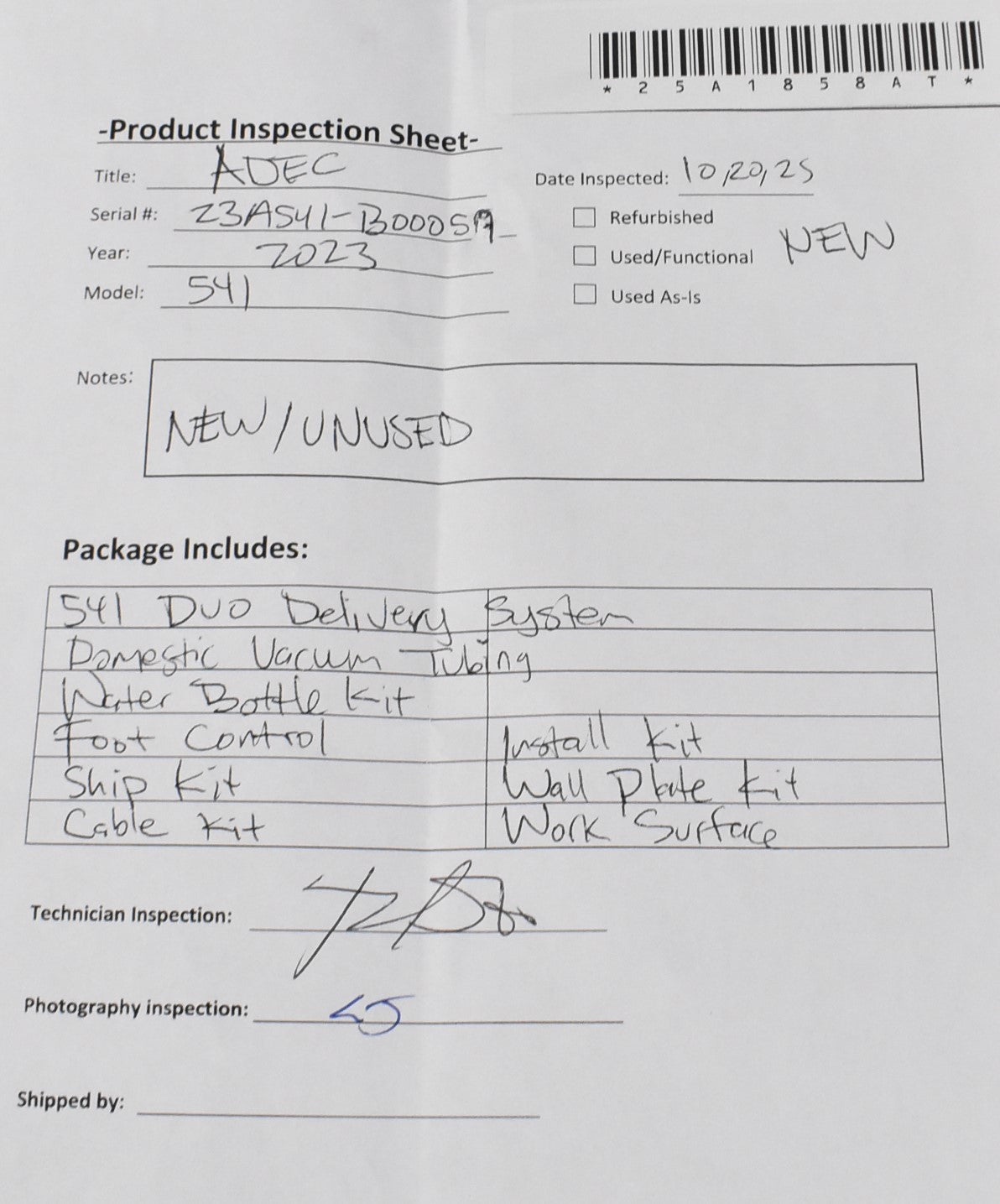 541 Duo Delivery System, Domestic Vacuum Tubing, Water Bottle Kit, Foot Control, Ship Kit, Cable Kit, Install Kit, Wall Plate Kit, Work Surface