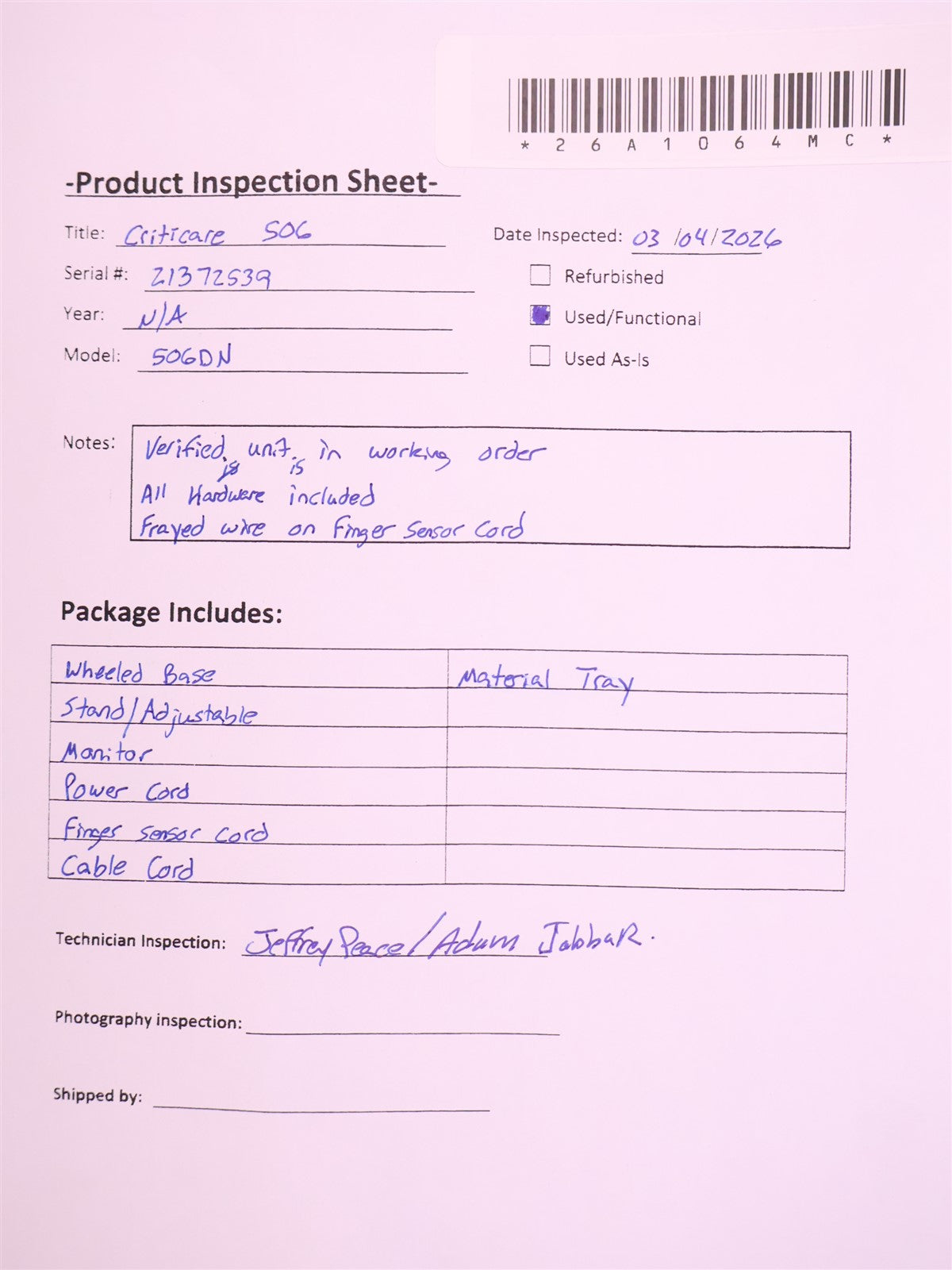 Visually inspected the unit for any damaged or missing parts and accessories. Function tested the unit and found to be fully functional with good cosmetic condition.