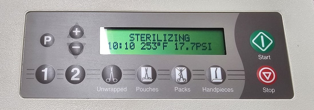 This autoclave is a 2018 model with 10,850 cycles run in it. Prior to testing this autoclave, it was disassembled down to the bare chassis, cleaned, rebuilt and refurbished. The Door Latch assembly was removed and rebuilt to insure proper operation. A new Reservoir Tank, Drain Hose and Condenser Coil were installed. Installed a new Fill / Vent Valve Manifold Assembly and Air Valve Solenoid. Installed a new Door Gasket, Dam Gasket, Heating Element, and Mesh Water Filters. Installed a new Top Panel and Keypad. Cleaned the Sterilizing Trays and Rack. Then proceeded to test the sterilizer. Connected it to a 120 volt power source, added distilled water and ran the autoclave through all it's preset sterilizing and drying cycles. To verify that this autoclave is achieving it's required maximum sterilizing temperature, it was temperature tested using a Max Register Thermometer, and found to reach 273 F for an entire cycle.