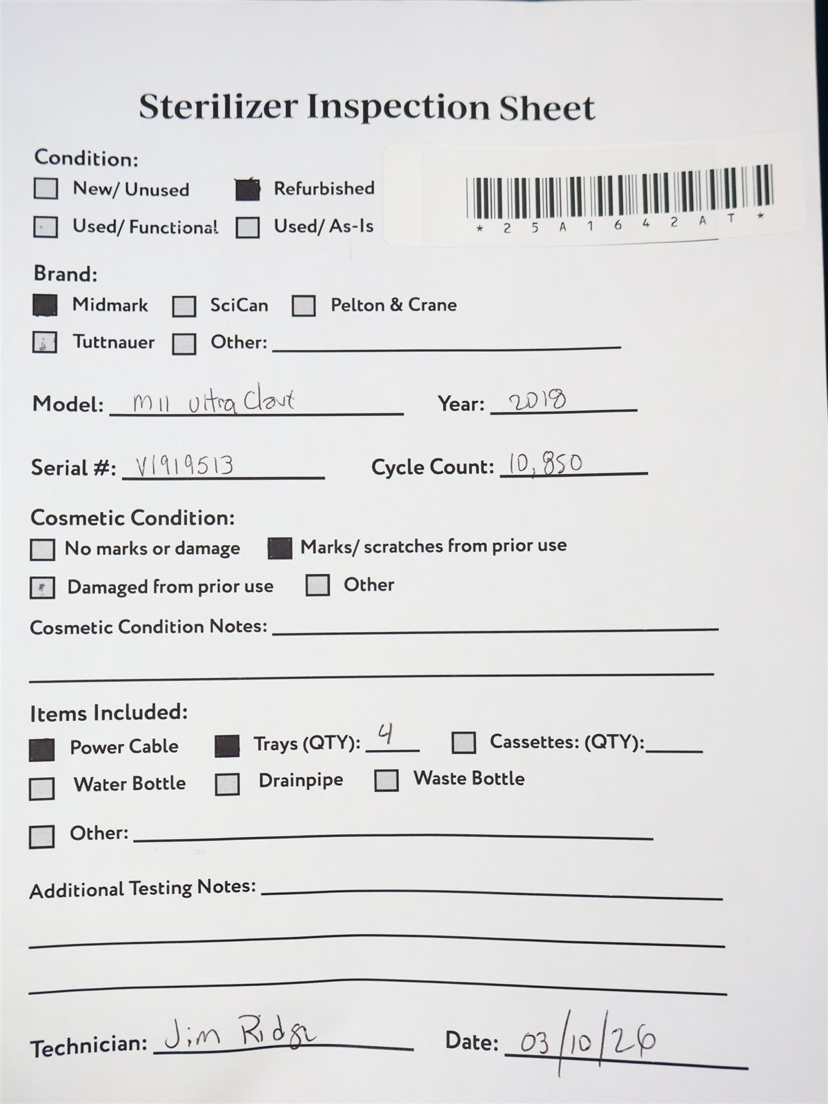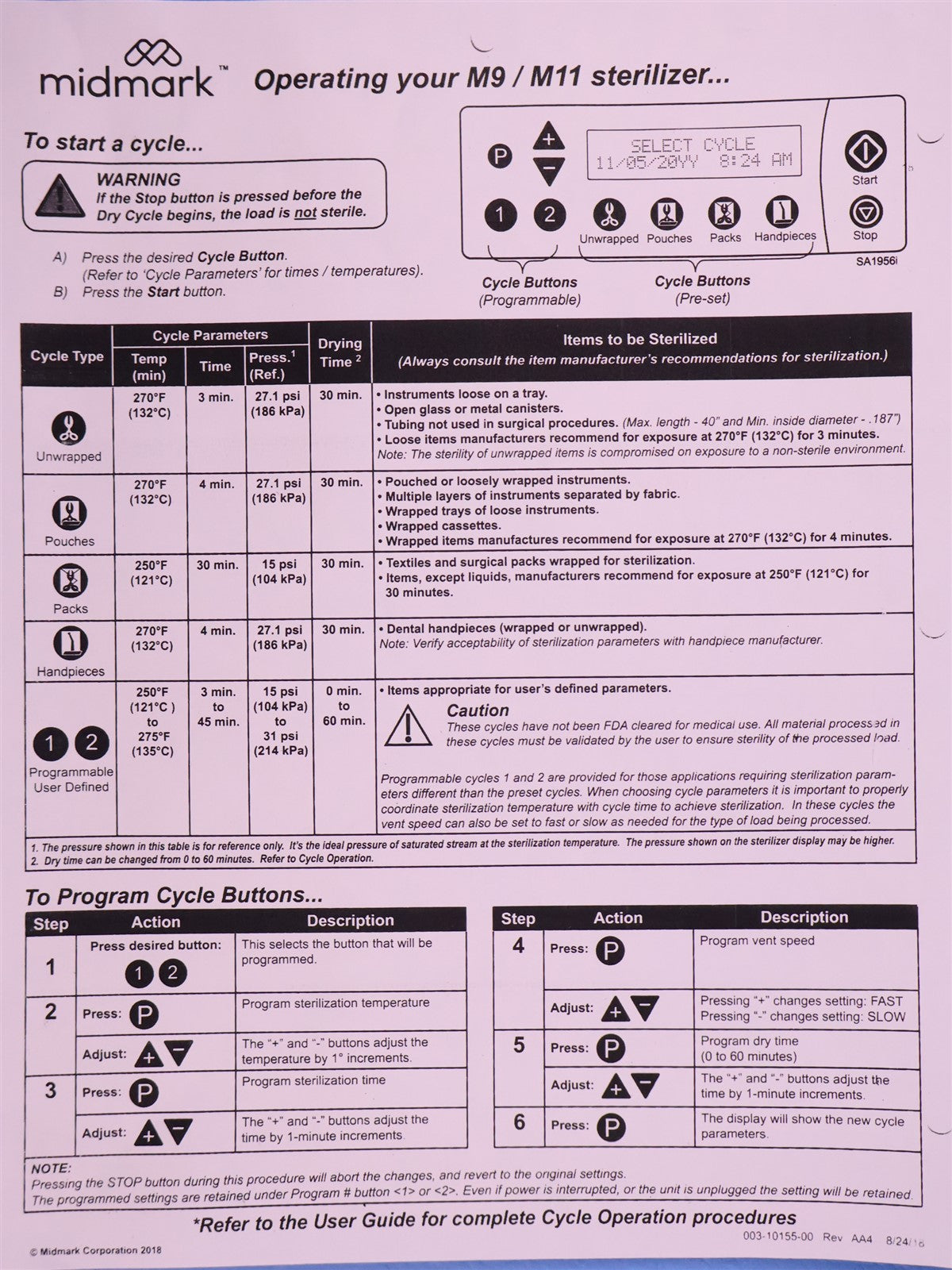 Your purchase will NOT include: - other accessories not shown or listed here.This autoclave is a 2018 model with 10,850 cycles run in it. Prior to testing this autoclave, it was disassembled down to the bare chassis, cleaned, rebuilt and refurbished. The Door Latch assembly was removed and rebuilt to insure proper operation. A new Reservoir Tank, Drain Hose and Condenser Coil were installed. Installed a new Fill / Vent Valve Manifold Assembly and Air Valve Solenoid. Installed a new Door Gasket, Dam Gasket, Heating Element, and Mesh Water Filters. Installed a new Top Panel and Keypad. Cleaned the Sterilizing Trays and Rack. Then proceeded to test the sterilizer. Connected it to a 120 volt power source, added distilled water and ran the autoclave through all it's preset sterilizing and drying cycles. To verify that this autoclave is achieving it's required maximum sterilizing temperature, it was temperature tested using a Max Register Thermometer, and found to reach 273 F for an entire cycle.
