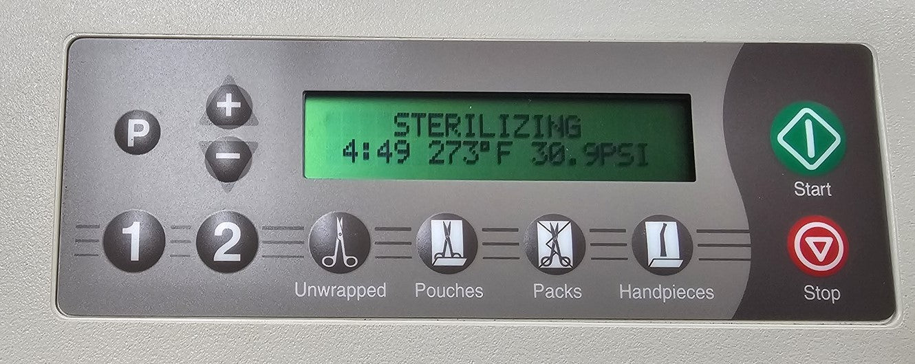 This autoclave is a 2013 model with 5,850 cycles run in it. An initial functionality test was done to verify that all major components were functional. Then this autoclave was disassembled down to the bare chassis, cleaned, rebuilt and refurbished. Removed and rebuilt the Door Latch assembly to insure proper door opening operation. Cleaned Reservoir Tank and installed a new Drain Hose and Condenser Coil. Installed a new Fill / Vent Valve Manifold Assembly and Air Valve Solenoid. Installed a new Door Gasket, Dam Gasket, Heating Element, and Mesh Water Filters. Installed a new Door Panel, Top Panel and Keypad. Cleaned the Sterilizing Trays and Rack. Then proceeded to test the sterilizer. Connected it to a 120 volt power source, added distilled water and ran the autoclave through all it's preset sterilizing and drying cycles. To verify that this autoclave is achieving it's required maximum sterilizing temperature, it was temperature tested using a Max Register Thermometer, and found to reach 273 F for an entire cycle.