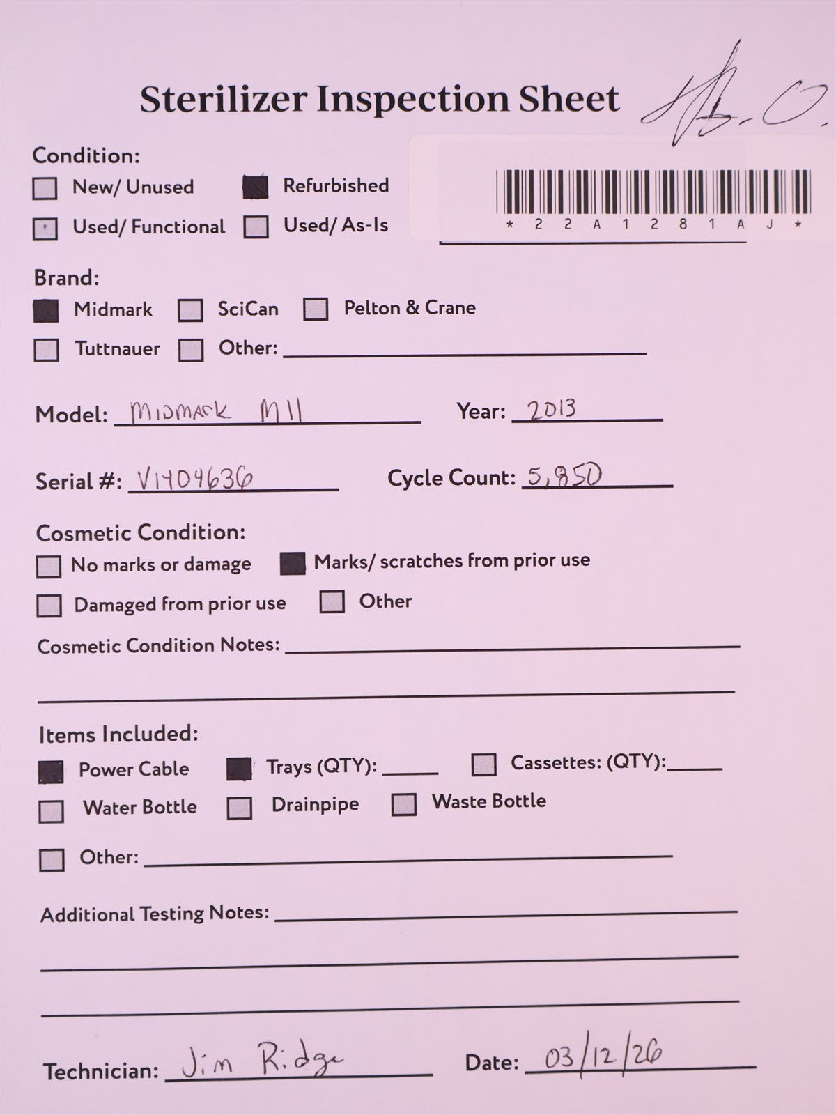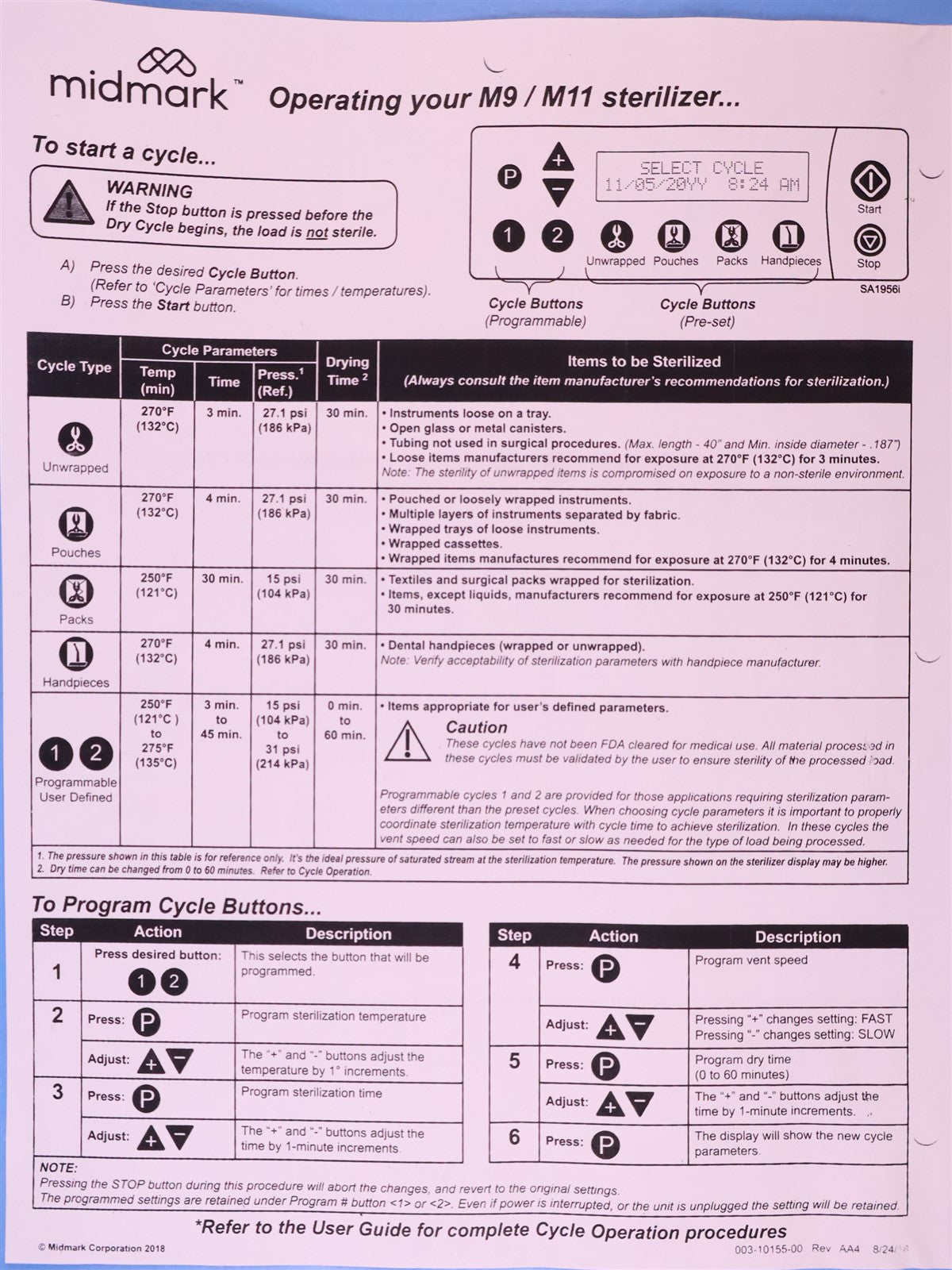 1 - Midmark M11 Automatic Autoclave 4 - Sterilizimng Trays w/Rack 1 - Power Cord