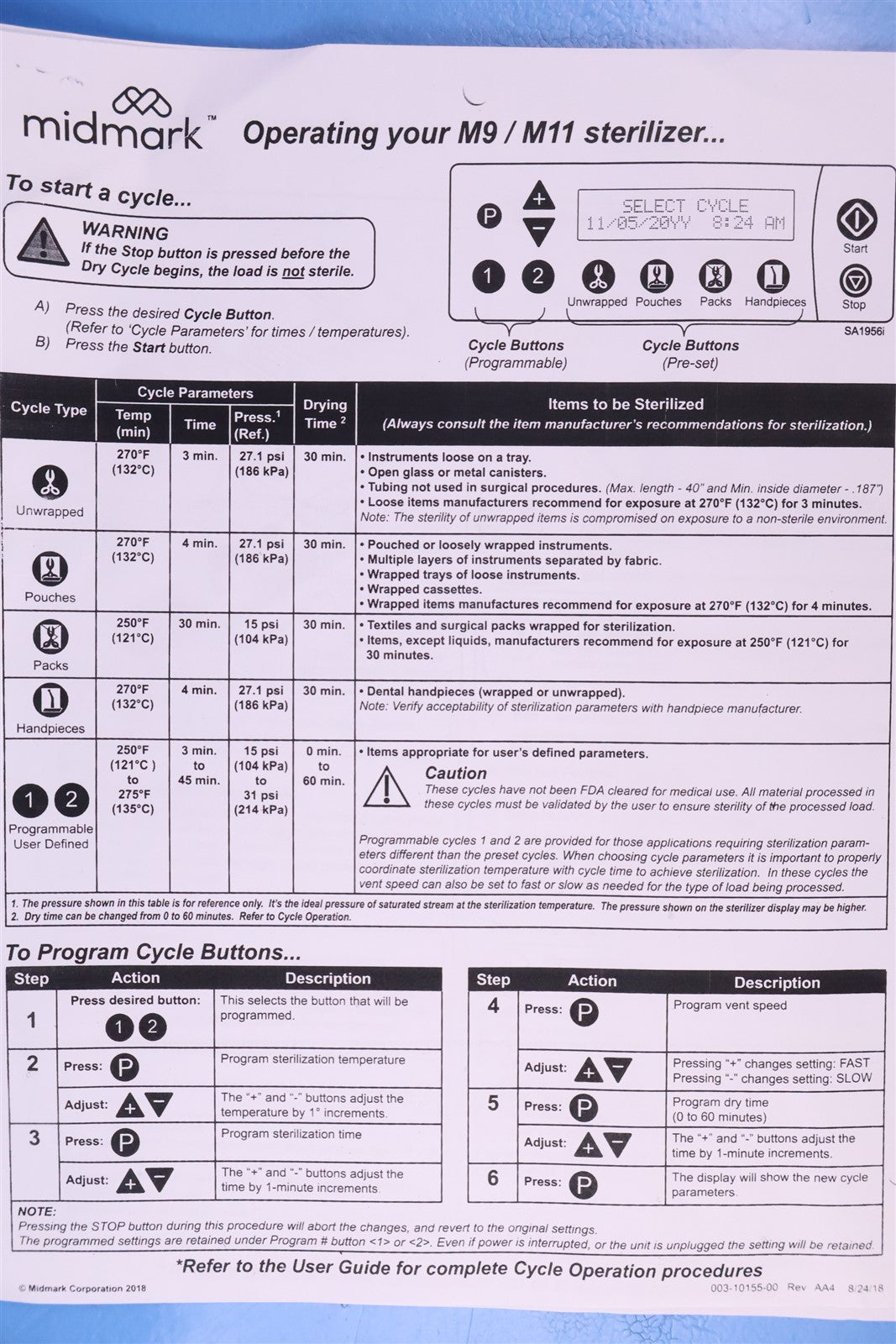 Your purchase will NOT include: TWO SMALL TRAYS - other accessories not shown or listed here.Prior to testing this autoclave, it was disassembled down to the bare chassis, cleaned, rebuilt and refurbished. Removed and rebuilt the Door Latch assembly. Cleaned Reservoir Tank and installed a new Drain Hose and Condenser Coil. Installed a new Fill / Vent Valve Manifold Assembly and Air Valve Solenoid. Installed a new Door Gasket, Dam Gasket, Heating Element, and Mesh Water Filters. Installed a new Keypad. Cleaned the Sterilizing Trays and Rack. Then proceeded to test the sterilizer. Connected it to a 120 volt power source, added distilled water and ran the autoclave through all it's preset sterilizing and drying cycles. To verify that this autoclave is achieving it's required maximum sterilizing temperature, it was temperature tested using a Max Register Thermometer, and found to reach 273 F for an entire cycle. Missing two small trays.