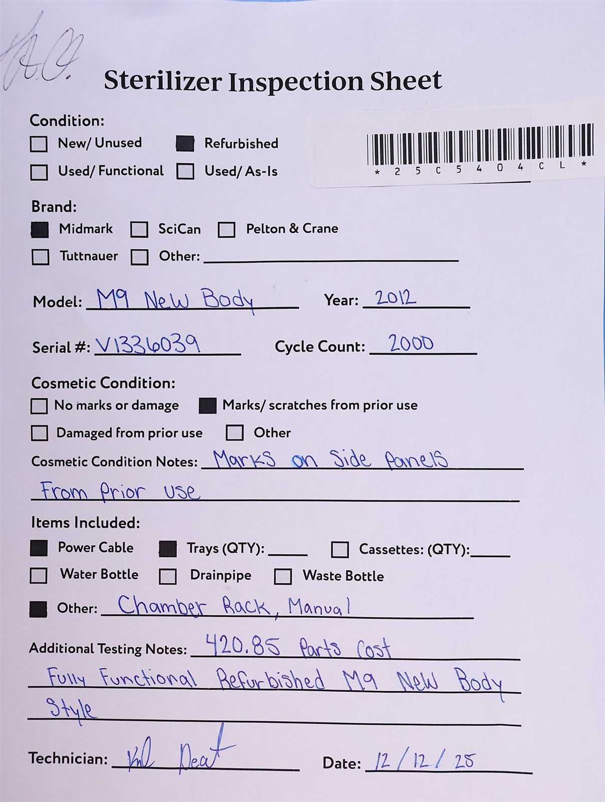 Prior to testing this autoclave, it was disassembled down to the bare chassis, cleaned, rebuilt and refurbished. Removed and rebuilt the Door Latch assembly. Cleaned Reservoir Tank and installed a new Drain Hose and Condenser Coil. Installed a new Fill / Vent Valve Manifold Assembly and Air Valve Solenoid. Installed a new Door Gasket, Dam Gasket, Heating Element, and Mesh Water Filters. Installed a new Keypad. Cleaned the Sterilizing Trays and Rack. Then proceeded to test the sterilizer. Connected it to a 120 volt power source, added distilled water and ran the autoclave through all it's preset sterilizing and drying cycles. To verify that this autoclave is achieving it's required maximum sterilizing temperature, it was temperature tested using a Max Register Thermometer, and found to reach 273 F for an entire cycle.