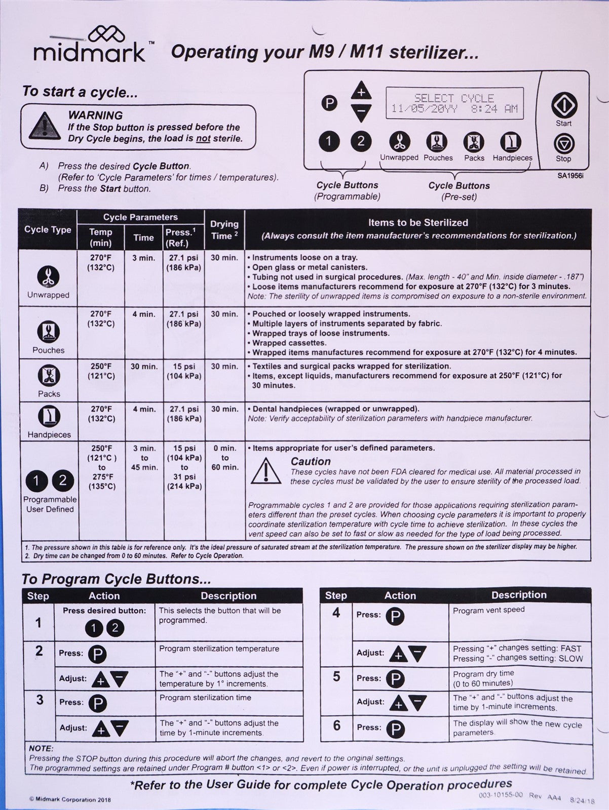 Your purchase will NOT include: - other accessories not shown or listed here.Prior to testing this autoclave, it was disassembled down to the bare chassis, cleaned, rebuilt and refurbished. Removed and rebuilt the Door Latch assembly. Cleaned Reservoir Tank and installed a new Drain Hose and Condenser Coil. Installed a new Fill / Vent Valve Manifold Assembly and Air Valve Solenoid. Installed a new Door Gasket, Dam Gasket, Heating Element, and Mesh Water Filters. Installed a new Keypad. Cleaned the Sterilizing Trays and Rack. Then proceeded to test the sterilizer. Connected it to a 120 volt power source, added distilled water and ran the autoclave through all it's preset sterilizing and drying cycles. To verify that this autoclave is achieving it's required maximum sterilizing temperature, it was temperature tested using a Max Register Thermometer, and found to reach 273 F for an entire cycle.