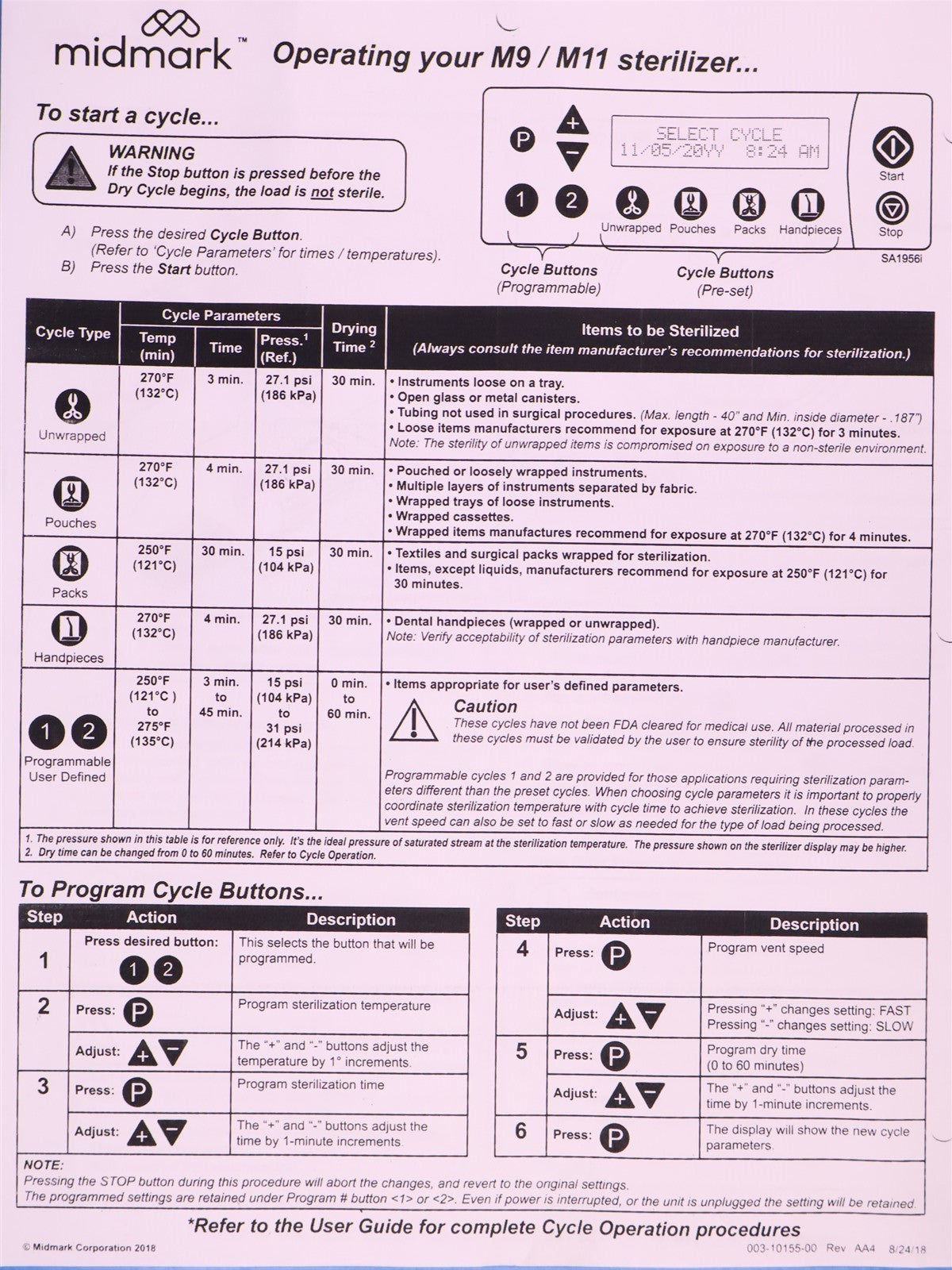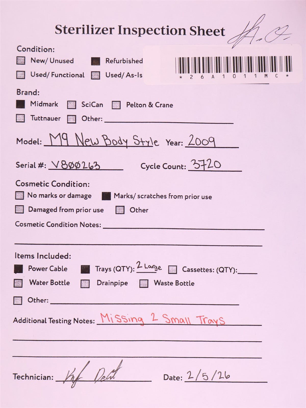 Your purchase will NOT include: Missing 2 Small Trays - other accessories not shown or listed here.Prior to testing this autoclave, it was disassembled down to the bare chassis, cleaned, rebuilt and refurbished. Removed and rebuilt the Door Latch assembly. Cleaned Reservoir Tank and installed a new Drain Hose and Condenser Coil. Installed a new Fill / Vent Valve Manifold Assembly and Air Valve Solenoid. Installed a new Door Gasket, Dam Gasket, Heating Element, and Mesh Water Filters. Installed a new Keypad. Cleaned the Sterilizing Trays and Rack. Then proceeded to test the sterilizer. Connected it to a 120 volt power source, added distilled water and ran the autoclave through all it's preset sterilizing and drying cycles. To verify that this autoclave is achieving it's required maximum sterilizing temperature, it was temperature tested using a Max Register Thermometer, and found to reach 273 F for an entire cycle. MISSING TWO SMALL TRAYS!