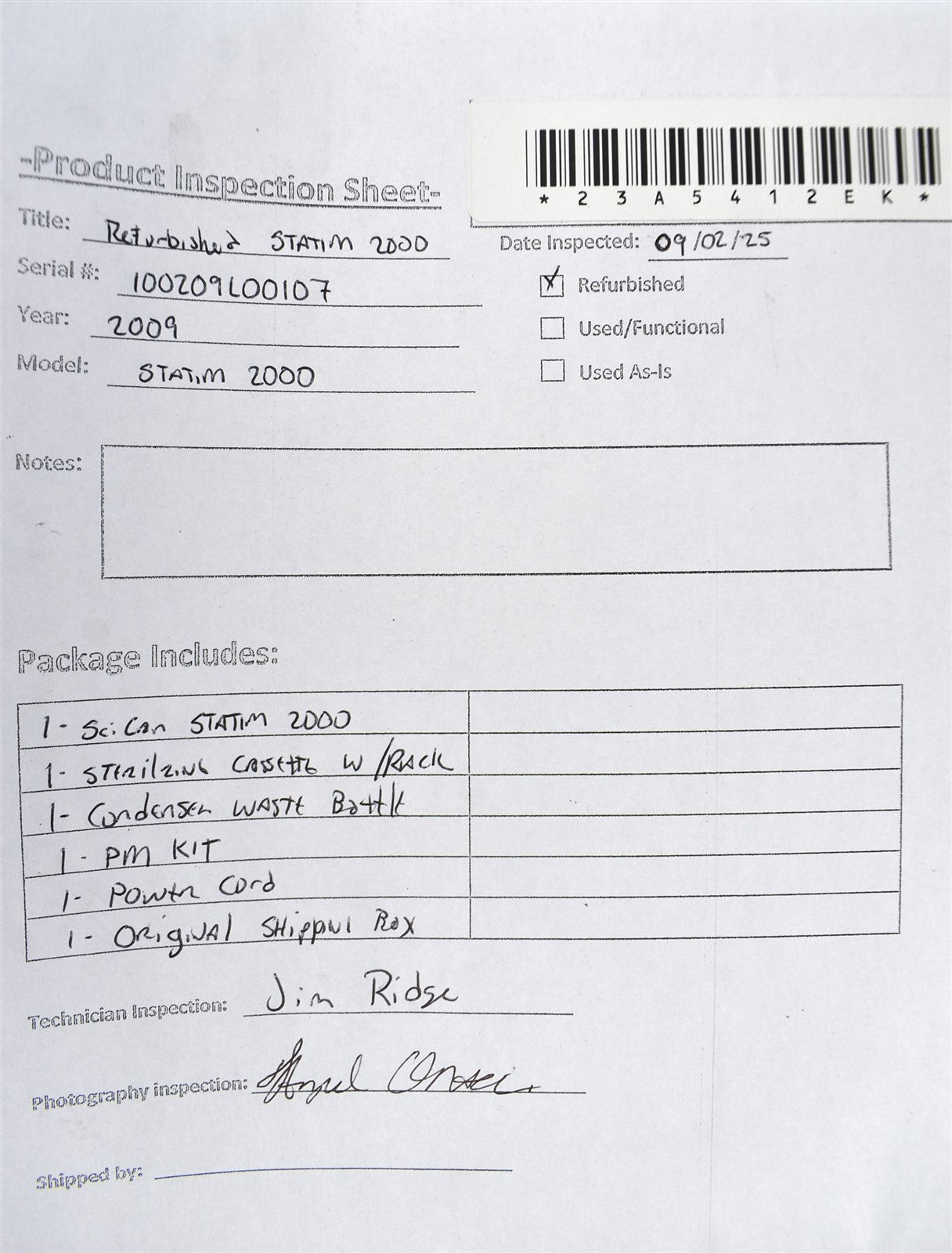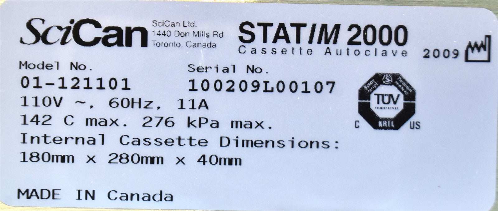 1 - SciCan STATIM 2000 Cassette Autoclave 1 - Sterilizing Cassette w/ Rack 1 - Condenser Waste Bottle 1 - Power Cord 1 - OEM Shipping Container