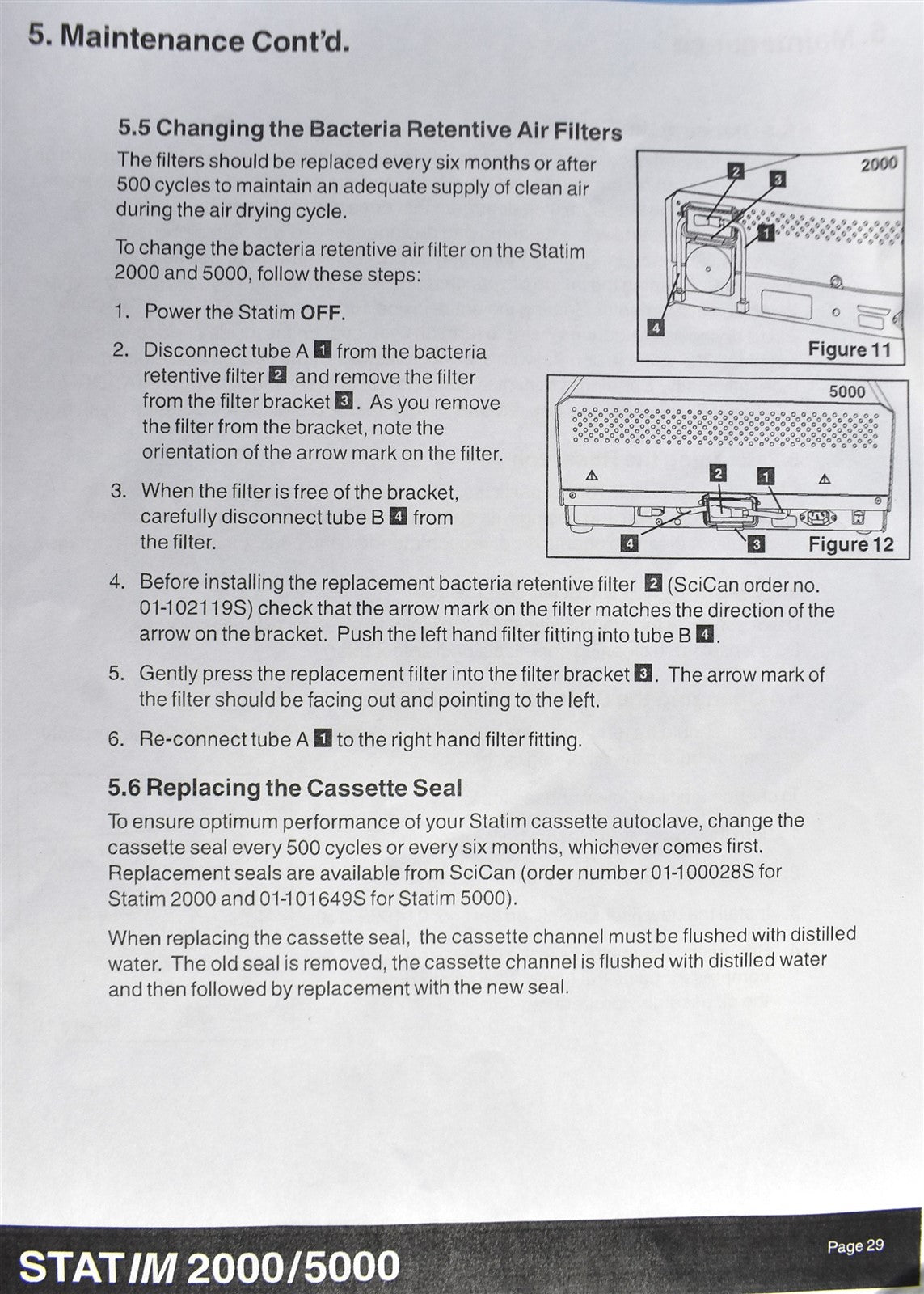 Your purchase will NOT include: - other accessories not shown or listed here. Fast, reliable sterilization with cassette-based system Large chamber capacity for handling more instruments per cycle Cycle times as short as 9 minutes for rapid turnaround Gentle sterilization process helps extend instrument life Easy-to-use interface with programmable cycles Compact, ergonomic design suitable for dental and medical practices Trusted worldwide for consistent sterilization performanceSTATIM 5000 This autoclave was put through an initial functionality test, to prove that it does indeed work. Once it was proven to operate correctly, it was disassembled down to it's bare chassis and cleaned up, then reassembled. To insure it continued future operation, preventive maintenance parts were installed, which include, a new Water Pump, Air Valve, Check Valve, Safety Valve, Compressor Air Filter and Biological Filter. The Reservoir Tank was cleaned and flushed and a new Reservoir Cap, Reservoir Filter and Water Pump and Drain Kit Upgrade was installed. The sterilizing cassette was also cleaned and a new Cassette Seal was installed. Prior to running test cycles on this sterilizer, the temperature sensors were calibrated. Then this autoclave was tested through all it's preset sterilizing and drying cycles multiple times. To verify that this unit is achieving it's highest maximum required sterilization temperature, it was tested using a Max Register Thermometer and found to exceed 273 F while running a sterilization cycle. -