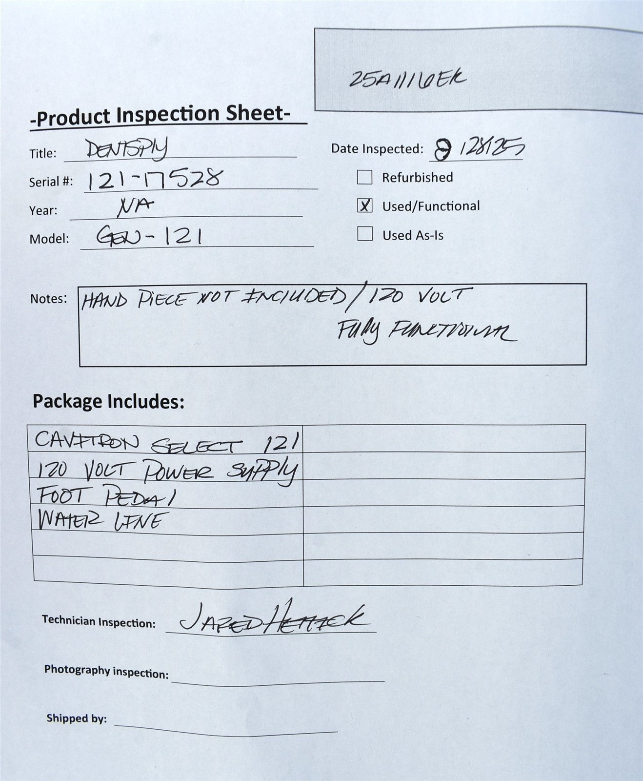 Dentsply Cavitron Select 121, I Turn the unit on using the Power Control knob. Confirm the power indicator light is illuminated.Attach handpiece to its cable connector. i Set the lavage control to maximum.Without an insert installed, hold the handpiece over a sink.Activate the foot control and flush the water line for at least 2 minutes. The unit has been cleaned and disinfected. Inspection Result: - Ready for Resale.