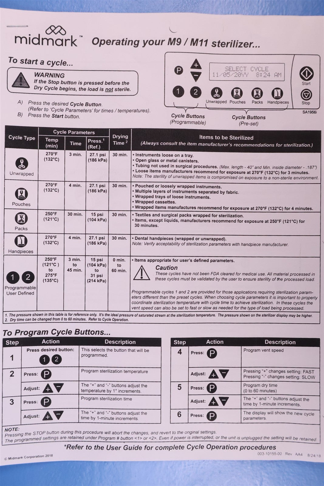 M9 NEW BODY Prior to testing this autoclave, it was disassembled down to the bare chassis, cleaned, rebuilt and refurbished. Removed and rebuilt the Door Latch assembly. Cleaned Reservoir Tank and installed a new Drain Hose and Condenser Coil. Installed a new Fill / Vent Valve Manifold Assembly and Air Valve Solenoid. Installed a new Door Gasket, Dam Gasket, Heating Element, and Mesh Water Filters. Installed a new Keypad. Cleaned the Sterilizing Trays and Rack. Then proceeded to test the sterilizer. Connected it to a 120 volt power source, added distilled water and ran the autoclave through all it's preset sterilizing and drying cycles. To verify that this autoclave is achieving it's required maximum sterilizing temperature, it was temperature tested using a Max Register Thermometer, and found to reach 273 F for an entire cycle.