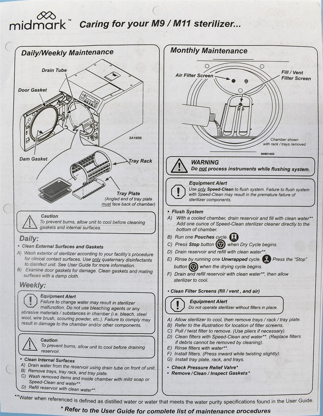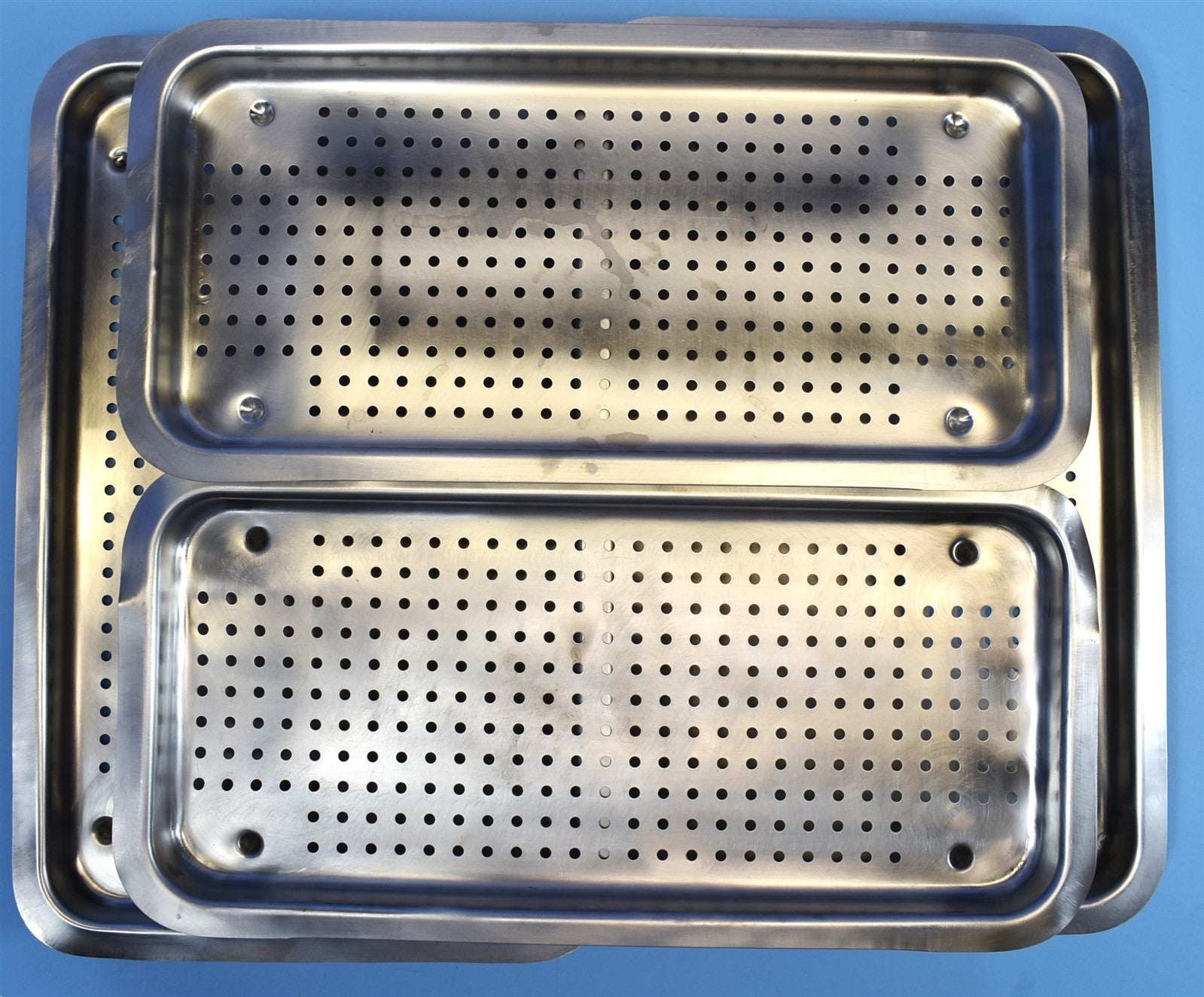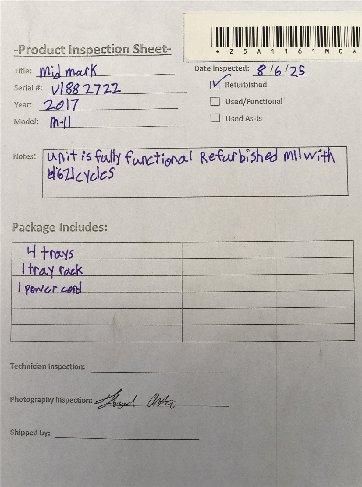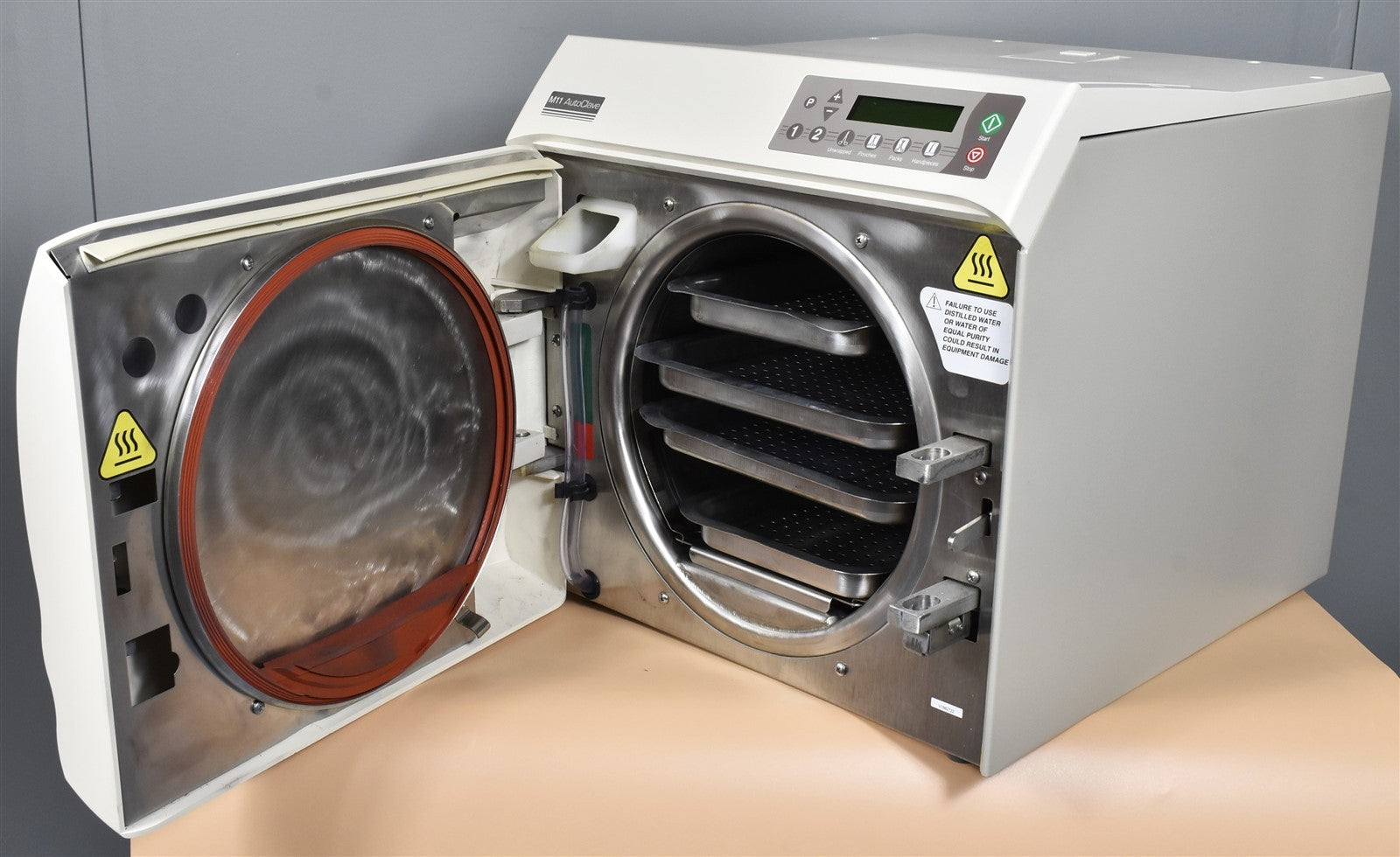 Your purchase will NOT include: - other accessories not shown or listed here.Prior to testing this autoclave, it was disassembled down to the bare chassis, cleaned, rebuilt and refurbished. Removed and rebuilt the Door Latch assembly. Cleaned Reservoir Tank and installed a new Drain Hose and Condenser Coil. Installed a new Fill / Vent Valve Manifold Assembly and Air Valve Solenoid. Installed a new Door Gasket, Dam Gasket, Heating Element, and Mesh Water Filters. Installed a new Keypad. Cleaned the Sterilizing Trays and Rack. Then proceeded to test the sterilizer. Connected it to a 120 volt power source, added distilled water and ran the autoclave through all it's preset sterilizing and drying cycles. To verify that this autoclave is achieving it's required maximum sterilizing temperature, it was temperature tested using a Max Register Thermometer, and found to reach 273 F for an entire cycle.