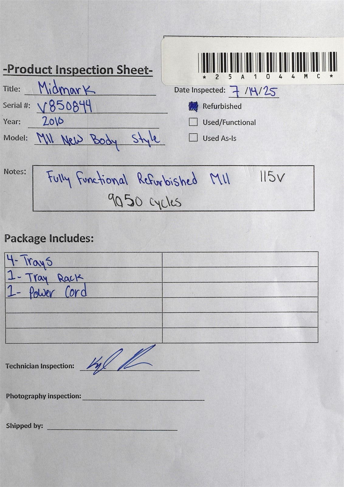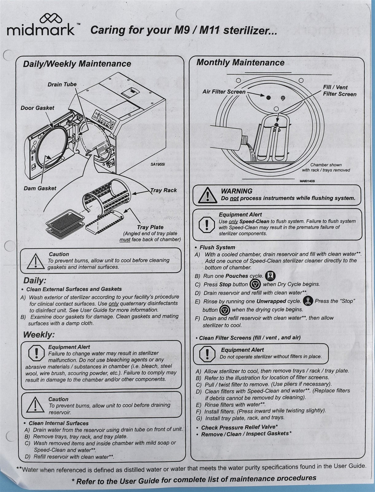 Your purchase will NOT include: manufacturer warranty, or any other accessories not shown or listed here.M11 NEW BODY Prior to testing this autoclave, it was disassembled down to the bare chassis, cleaned, rebuilt and refurbished. Removed and rebuilt the Door Latch assembly. Cleaned Reservoir Tank and installed a new Drain Hose and Condenser Coil. Installed a new Fill / Vent Valve Manifold Assembly and Air Valve Solenoid. Installed a new Door Gasket, Dam Gasket, Heating Element, and Mesh Water Filters. Installed a new Keypad. Cleaned the Sterilizing Trays and Rack. Then proceeded to test the sterilizer. Connected it to a 120 volt power source, added distilled water and ran the autoclave through all it's preset sterilizing and drying cycles. To verify that this autoclave is achieving it's required maximum sterilizing temperature, it was temperature tested using a Max Register Thermometer, and found to reach 273 F for an entire cycle.