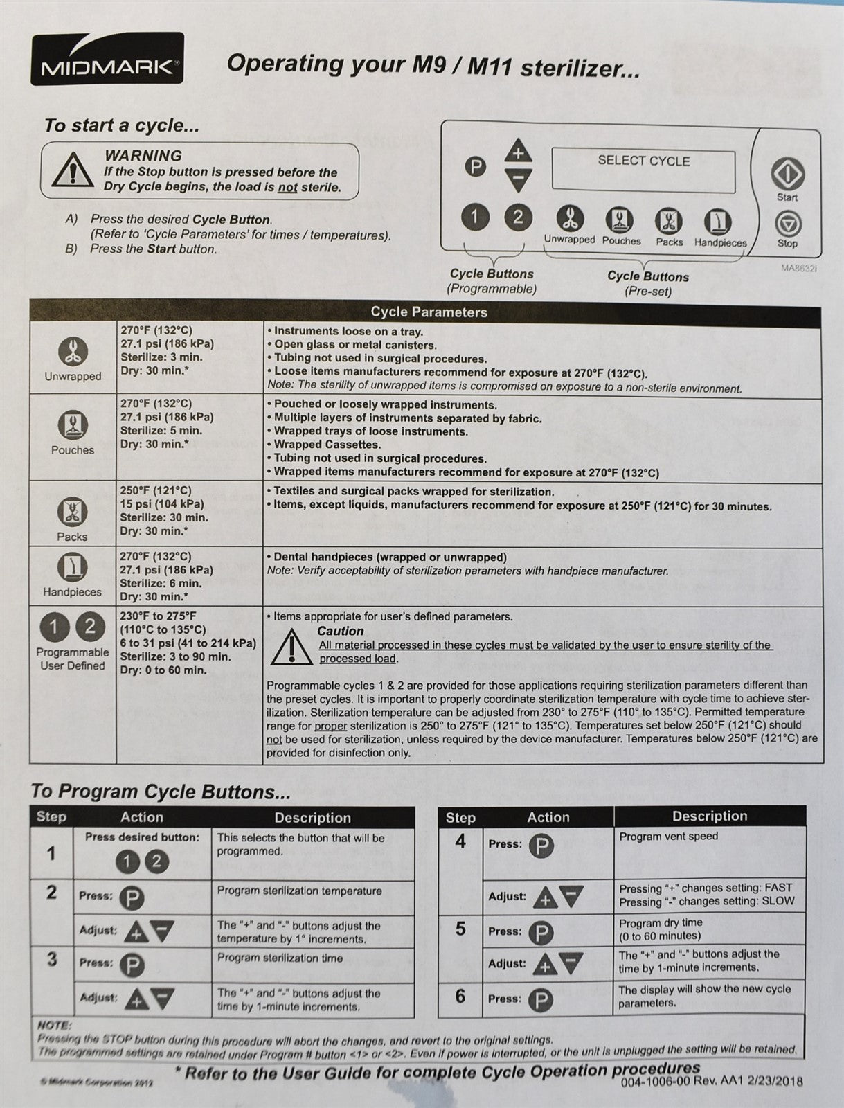 Your purchase will NOT include: - other accessories not shown or listed here. Midmark M11 Steam Autoclave Efficient sterilization cycles for dental instruments Automatic water refill and drainage for convenience Large chamber accommodates multiple instruments or cassettes User-friendly interface with cycle monitoring and alerts Compact design suitable for operatories and labs Durable construction for long-term reliability Validated sterilization performance for clinical safety Energy-efficient operation for reduced utility costs Trusted Midmark engineering and customer supportM11 NEW BODY Prior to testing this autoclave, it was disassembled down to the bare chassis, cleaned, rebuilt and refurbished. Removed and rebuilt the Door Latch assembly. Cleaned Reservoir Tank and installed a new Drain Hose and Condenser Coil. Installed a new Fill / Vent Valve Manifold Assembly and Air Valve Solenoid. Installed a new Door Gasket, Dam Gasket, Heating Element, and Mesh Water Filters. Installed a new Keypad. Cleaned the Sterilizing Trays and Rack. Then proceeded to test the sterilizer. Connected it to a 120 volt power source, added distilled water and ran the autoclave through all it's preset sterilizing and drying cycles. To verify that this autoclave is achieving it's required maximum sterilizing temperature, it was temperature tested using a Max Register Thermometer, and found to reach 273 F for an entire cycle.