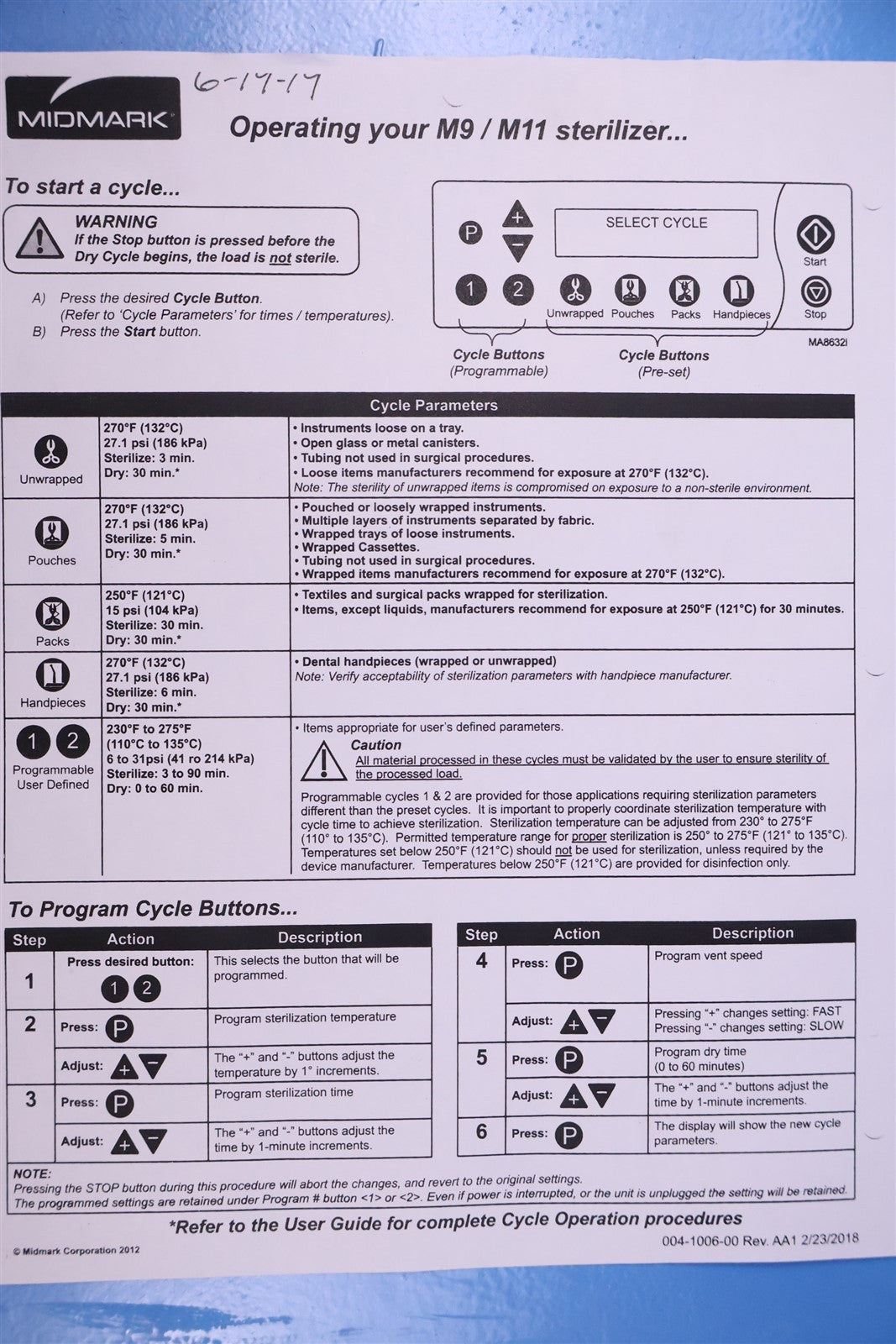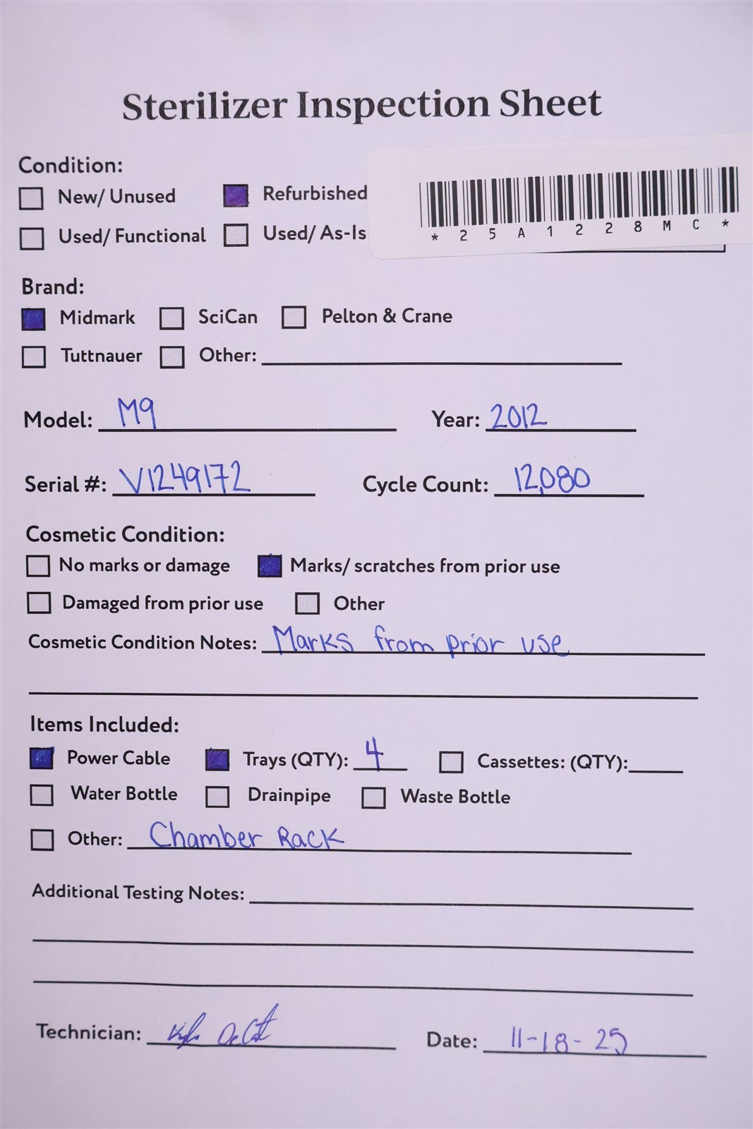 M9 NEW BODY Prior to testing this autoclave, it was disassembled down to the bare chassis, cleaned, rebuilt and refurbished. Removed and rebuilt the Door Latch assembly. Cleaned Reservoir Tank and installed a new Drain Hose and Condenser Coil. Installed a new Fill / Vent Valve Manifold Assembly and Air Valve Solenoid. Installed a new Door Gasket, Dam Gasket, Heating Element, and Mesh Water Filters. Installed a new Keypad. Cleaned the Sterilizing Trays and Rack. Then proceeded to test the sterilizer. Connected it to a 120 volt power source, added distilled water and ran the autoclave through all it's preset sterilizing and drying cycles. To verify that this autoclave is achieving it's required maximum sterilizing temperature, it was temperature tested using a Max Register Thermometer, and found to reach 273 F for an entire cycle.