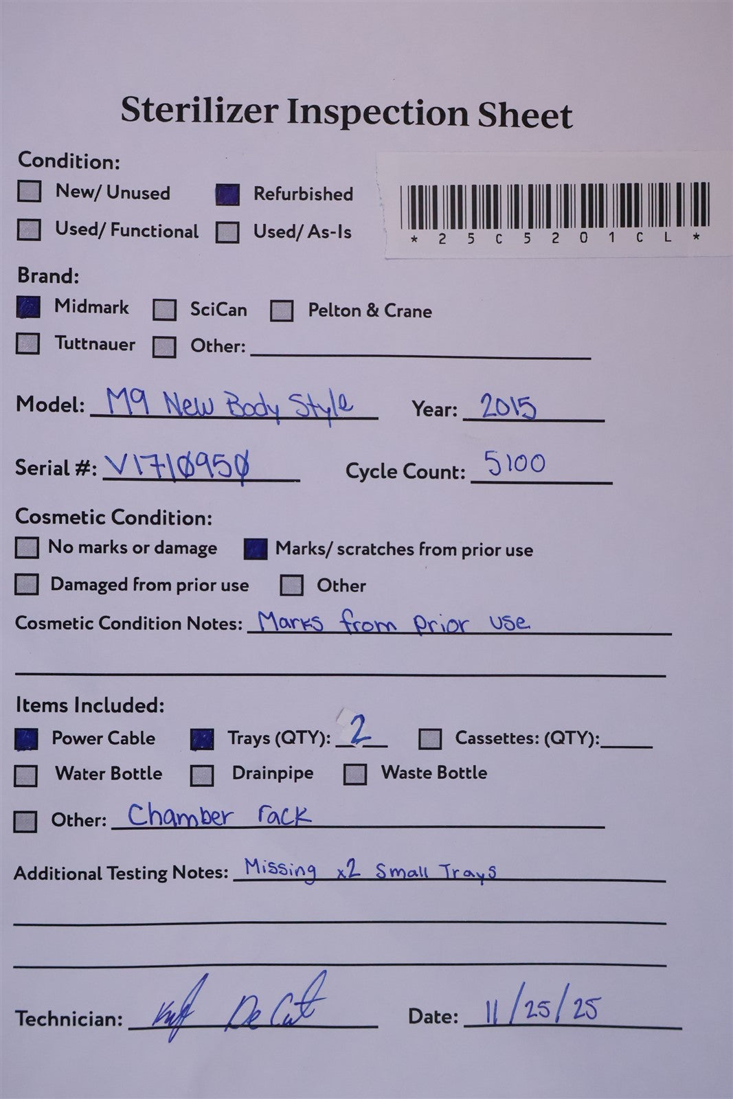 M9 NEW BODY Prior to testing this autoclave, it was disassembled down to the bare chassis, cleaned, rebuilt and refurbished. Removed and rebuilt the Door Latch assembly. Cleaned Reservoir Tank and installed a new Drain Hose and Condenser Coil. Installed a new Fill / Vent Valve Manifold Assembly and Air Valve Solenoid. Installed a new Door Gasket, Dam Gasket, Heating Element, and Mesh Water Filters. Installed a new Keypad. Cleaned the Sterilizing Trays and Rack. Then proceeded to test the sterilizer. Connected it to a 120 volt power source, added distilled water and ran the autoclave through all it's preset sterilizing and drying cycles. To verify that this autoclave is achieving it's required maximum sterilizing temperature, it was temperature tested using a Max Register Thermometer, and found to reach 273 F for an entire cycle.