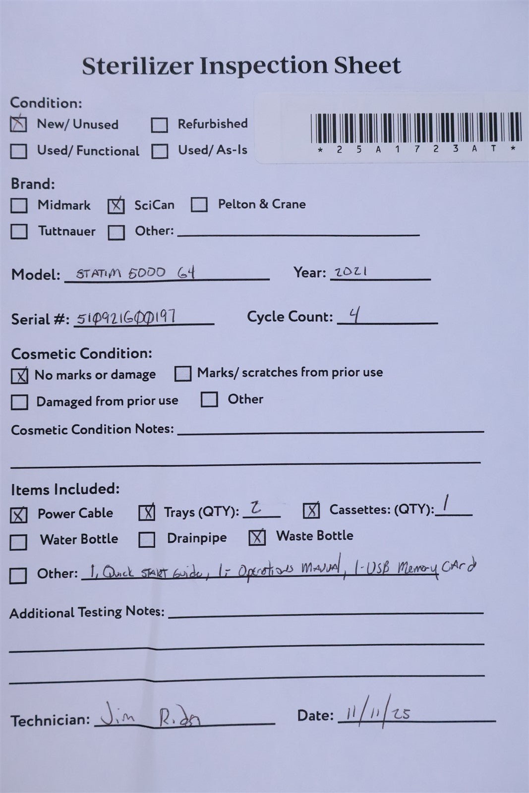 1 - SciCan STATIM 5000 G4 Cassette Autoclave 1 - Sterilizing Cassette w/ 2 racks 1 - Operations and Maintenance Manual 1 - Condenser Waste Bottle 1 - Cassette Cabinet Mat 1 - USB Memory Stick 1 - Shipping Container 1 - Power Cord