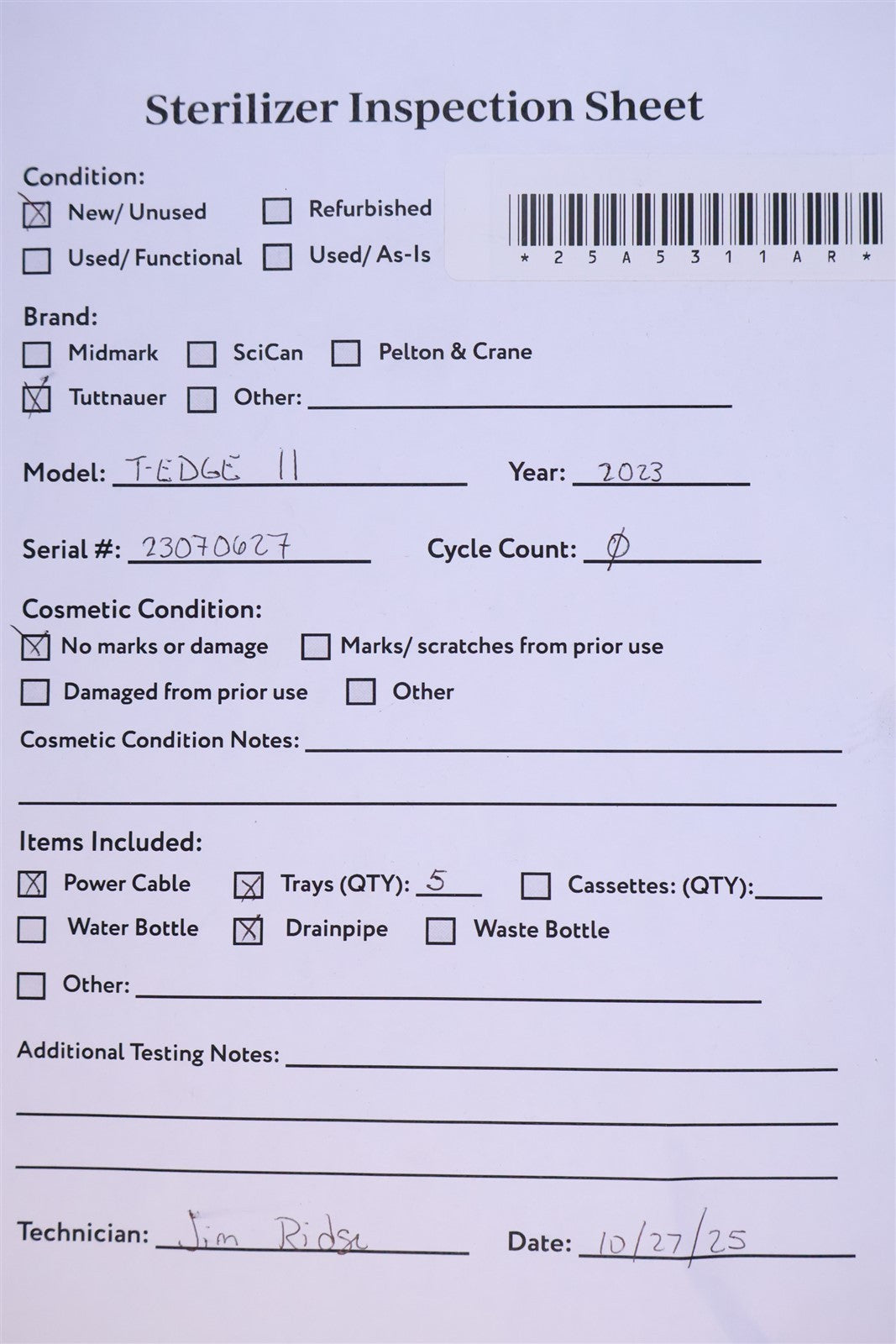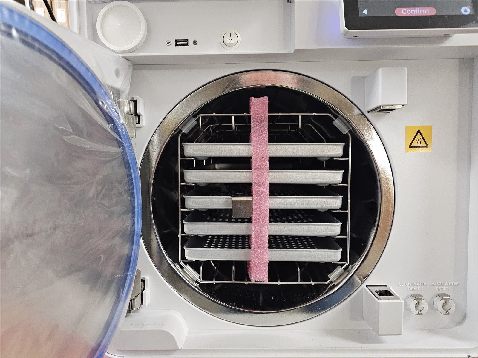 This autoclave is a 2023 model with ZERO cycles run on it. It is an open box model that was powered on to verify that it functions, and that all the accessories were with it.