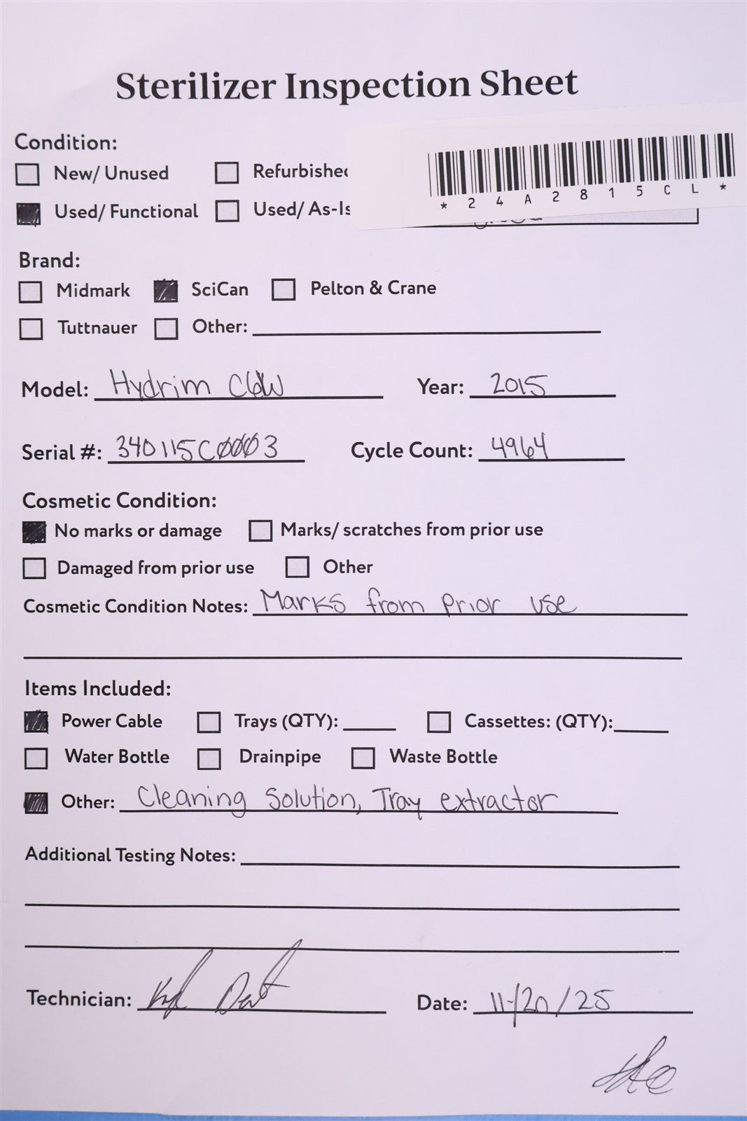 Visually inspected this Hydrim C61W washer system for any damage or missing components. This unit was unable to undergo a complete functionality test due to not having correct connections. Powered unit on to ensure at least does that. Unit has light use, includes all accessories including manual. Unit successfully powers on with no error codes presented. FULLY FUNCTIONAL.