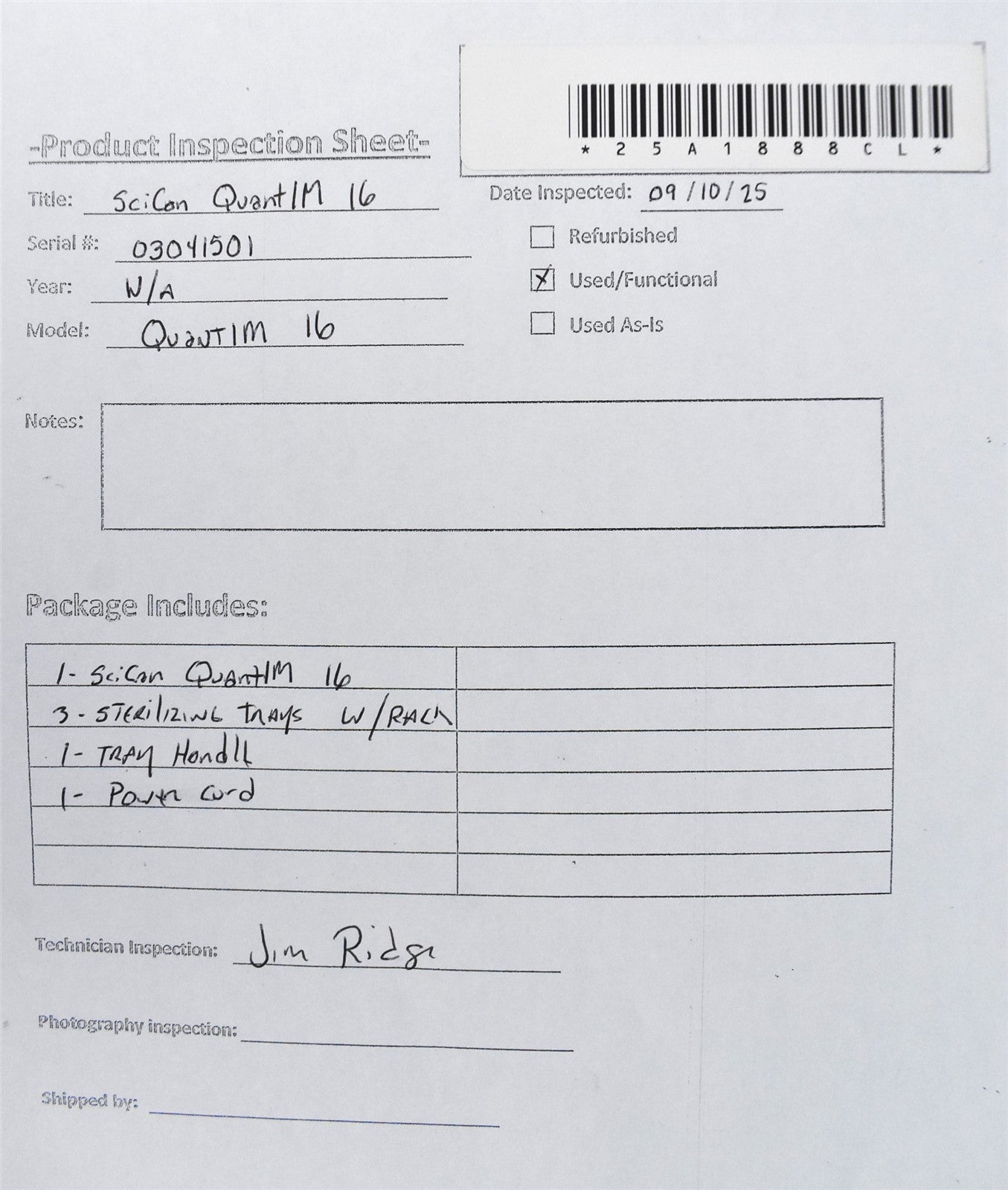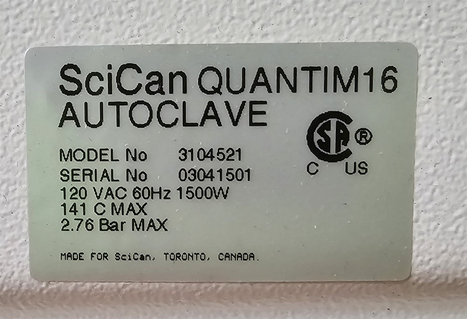 1 - SciCan QuantIM 16 Autoclave 3 - Sterilizing Trays w/ Rack 1 - Tray Handle 1 - Attached Power Cord