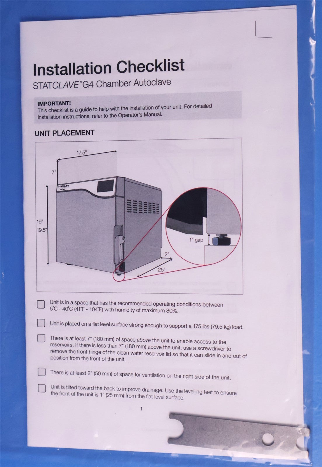 1 - SciCan STATCLAVE G4 4 - Sterilizing Trays w/ Rack 1 - Country Kit 1 - 120 Volt Power Cord
