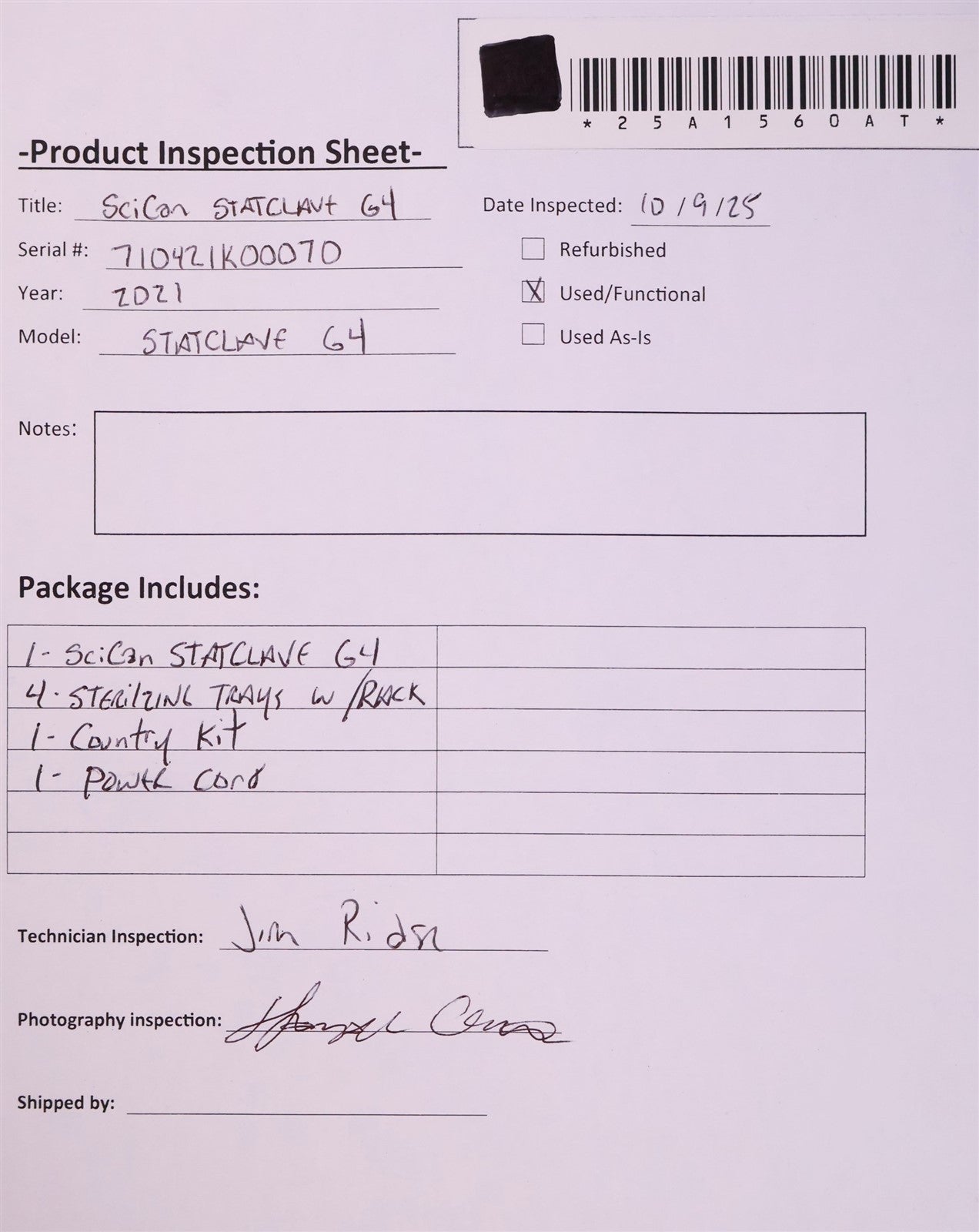 This autoclave is a 2021 model with less then 100 cycles run on it. This sterilizer was tested and proven to be functional, then a new firmware upgrade was installed. Then this autoclave was ran through all it's preset Sterilizing and Drying cycles several. To verify that this sterilizer is achieving it's maximum required sterilizing temperature during a cycle, it was tested using a Max Register Thermometer and found to 273 F during a cycle. This autoclave DOES NOT come with the required lines and waste bottle needed for operation, and these will have to be obtained directly from SciCan.
