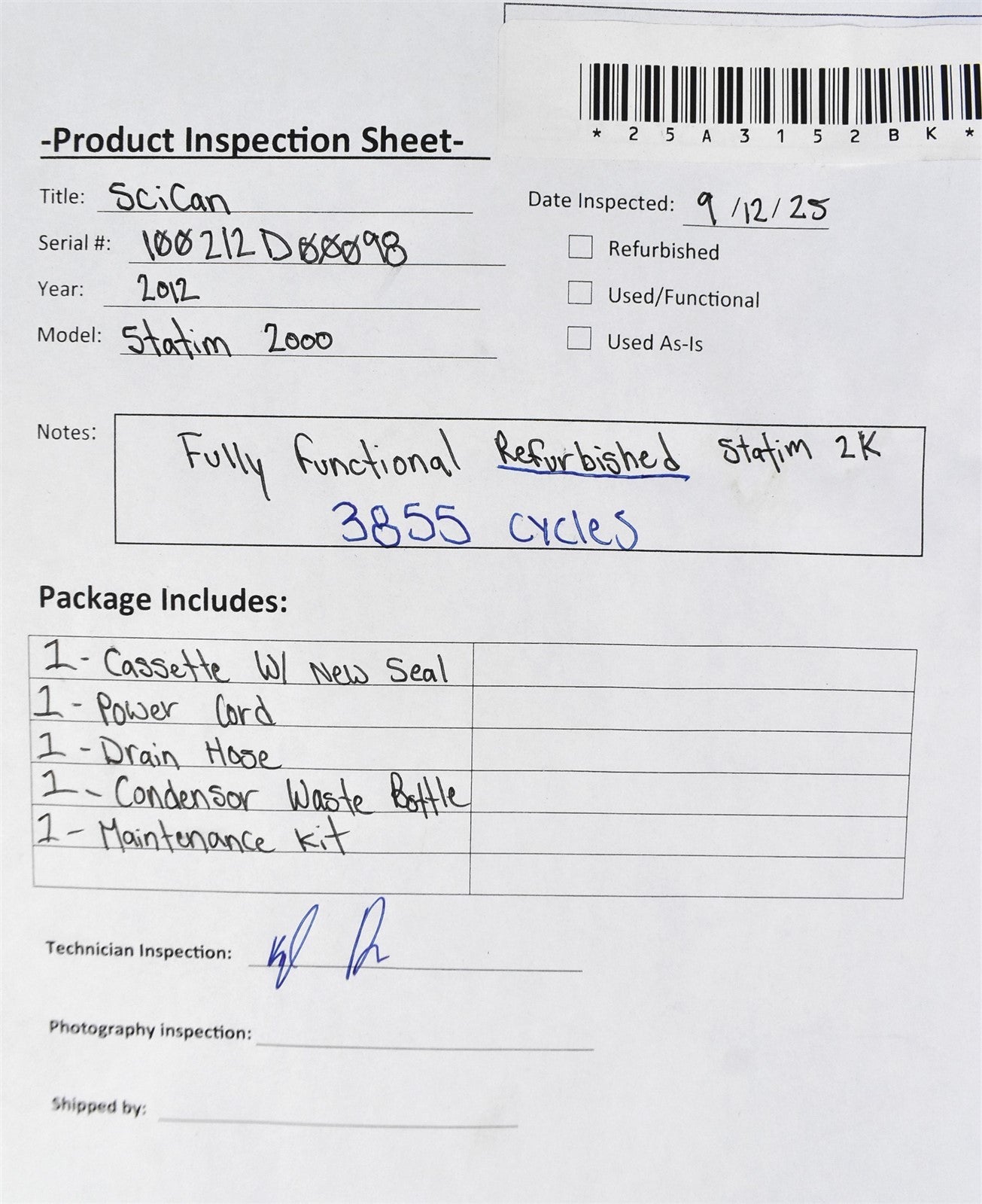 Your purchase will NOT include: - other accessories not shown or listed here.This autoclave was put through an initial functionality test, to prove that it does indeed work. Once it was proven to operate correctly, it was disassembled down to it's bare chassis and cleaned up, then reassembled. To insure it continued future operation, preventive maintenance parts were installed, which include, a new Water Pump, Air Valve, Check Valve, Safety Valve, Compressor Air Filter and Biological Filter. The Reservoir Tank was cleaned and flushed and a new Reservoir Cap, Reservoir Filter and Water Pump and Drain Kit Upgrade was installed. The sterilizing cassette was also cleaned and a new Cassette Seal was installed. Prior to running test cycles on this sterilizer, the temperature sensors were calibrated. Then this autoclave was tested through all it's preset sterilizing and drying cycles multiple times. To verify that this unit is achieving it's highest maximum required sterilization temperature, it was tested using a Max Register Thermometer and found to exceed 273 F while running a sterilization cycle