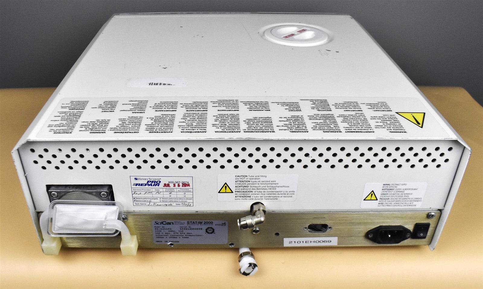 This autoclave was put through an initial functionality test, to prove that it does indeed work. Once it was proven to operate correctly, it was disassembled down to it's bare chassis and cleaned up, then reassembled. To insure it continued future operation, preventive maintenance parts were installed, which include, a new Water Pump, Air Valve, Check Valve, Safety Valve, Compressor Air Filter and Biological Filter. The Reservoir Tank was cleaned and flushed and a new Reservoir Cap, Reservoir Filter and Water Pump and Drain Kit Upgrade was installed. The sterilizing cassette was also cleaned and a new Cassette Seal was installed. Prior to running test cycles on this sterilizer, the temperature sensors were calibrated. Then this autoclave was tested through all it's preset sterilizing and drying cycles multiple times. To verify that this unit is achieving it's highest maximum required sterilization temperature, it was tested using a Max Register Thermometer and found to exceed 273 F while running a sterilization cycle