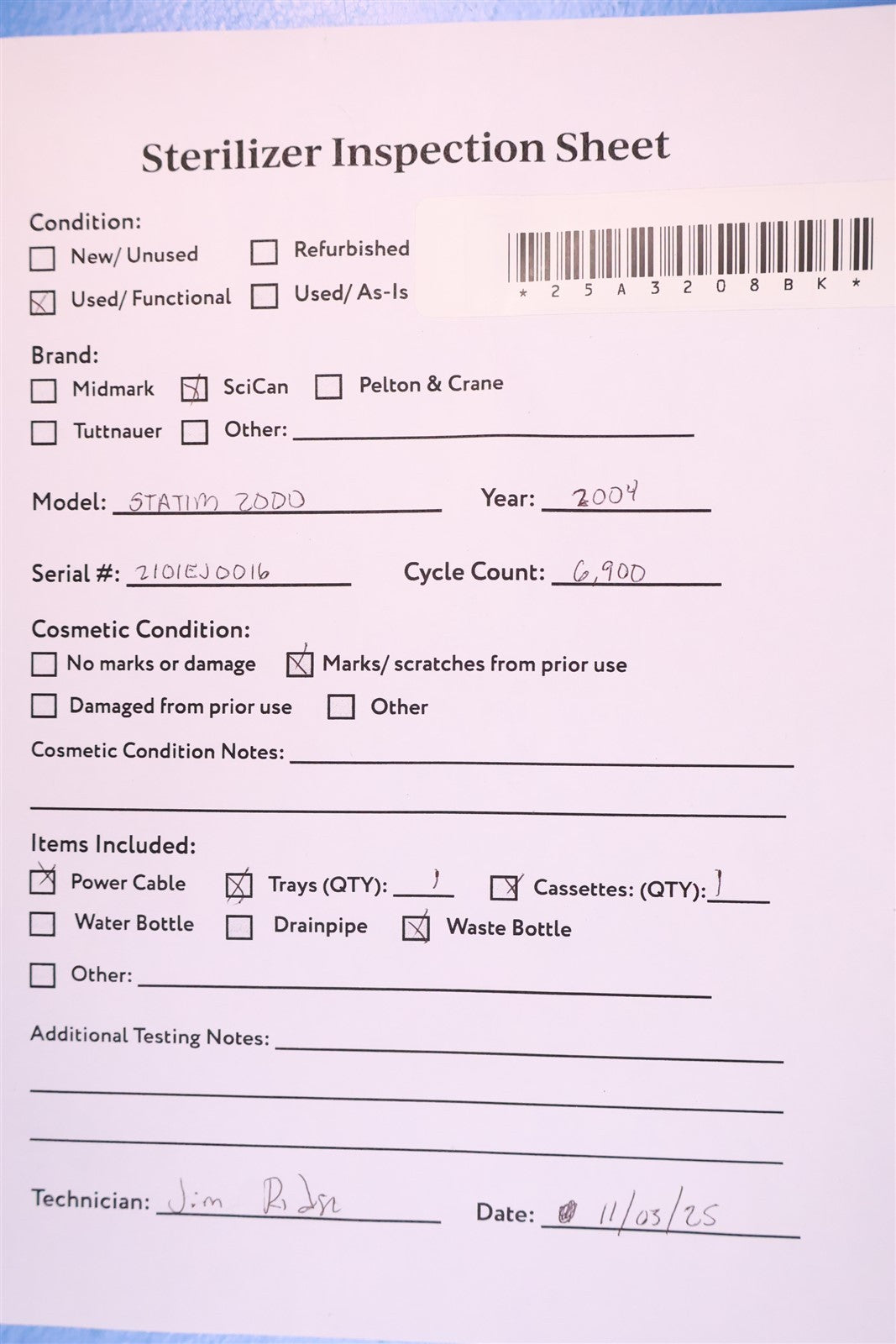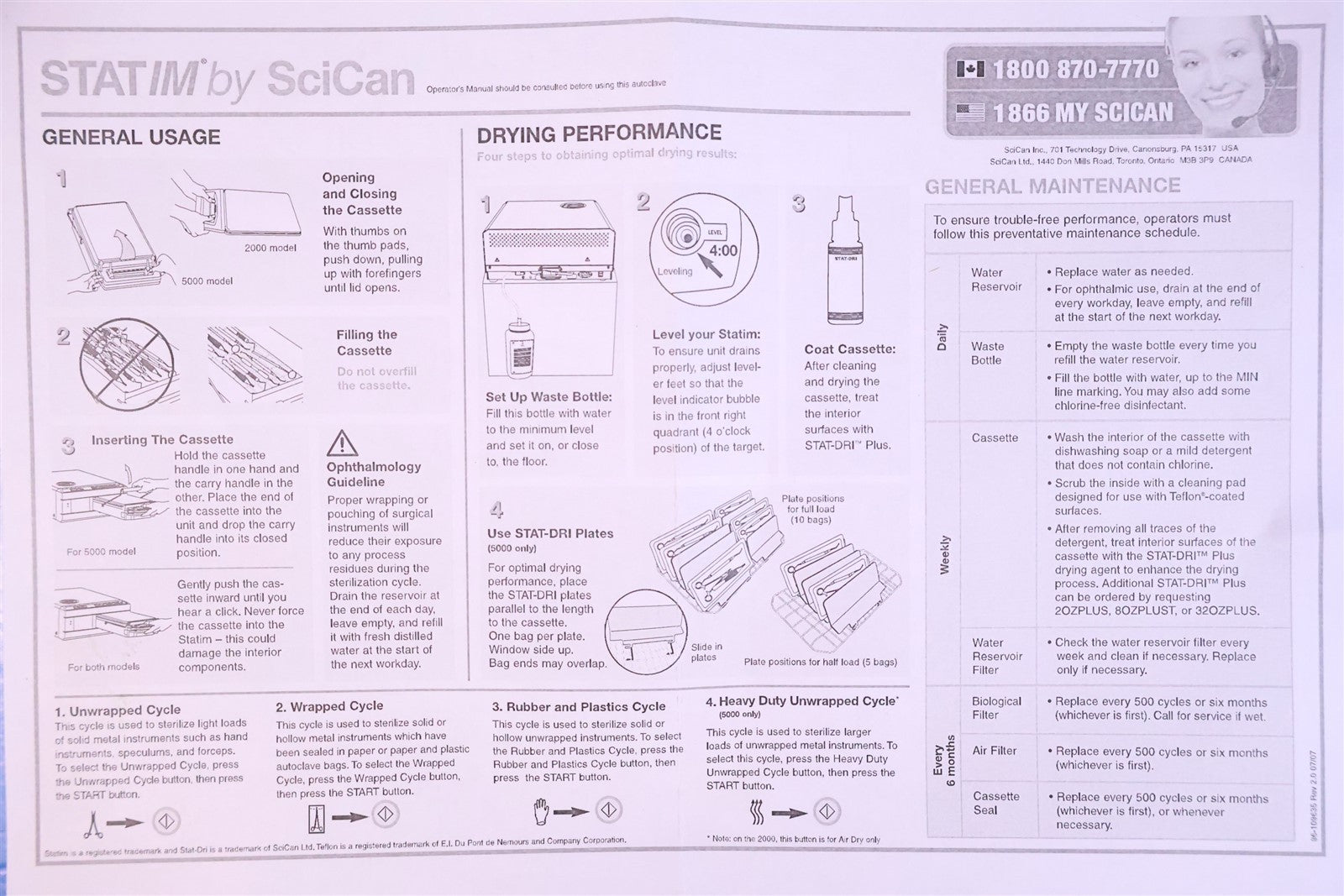 1 - SciCan STATIM 2000 Cassette Autoclave 1 - Sterilizing Cassette w/ Rack 1 - Condenser Waste Bottle 1 - Power Cord