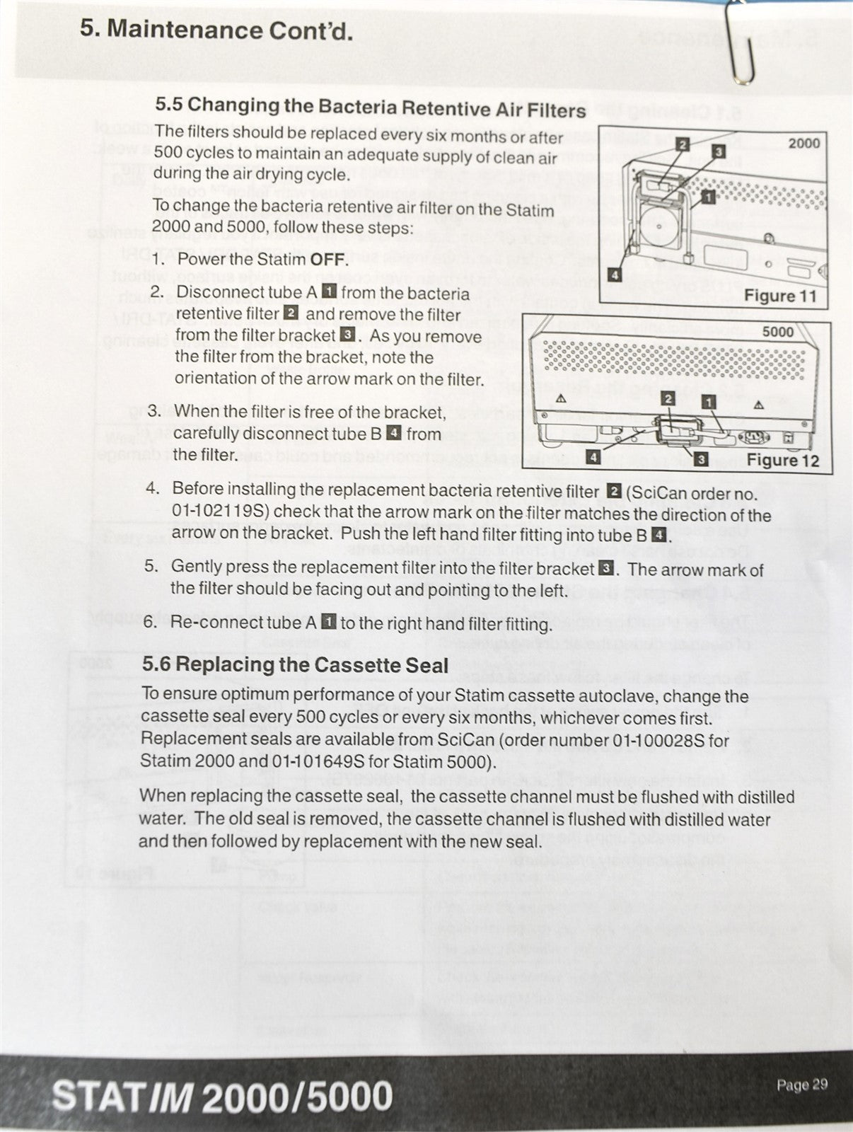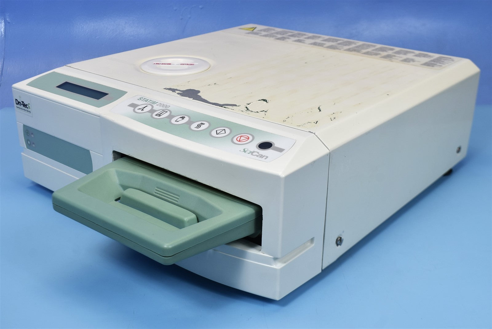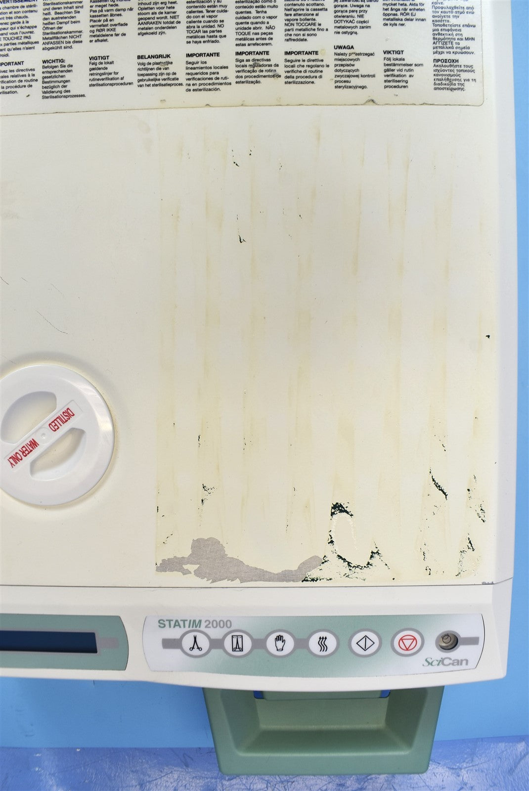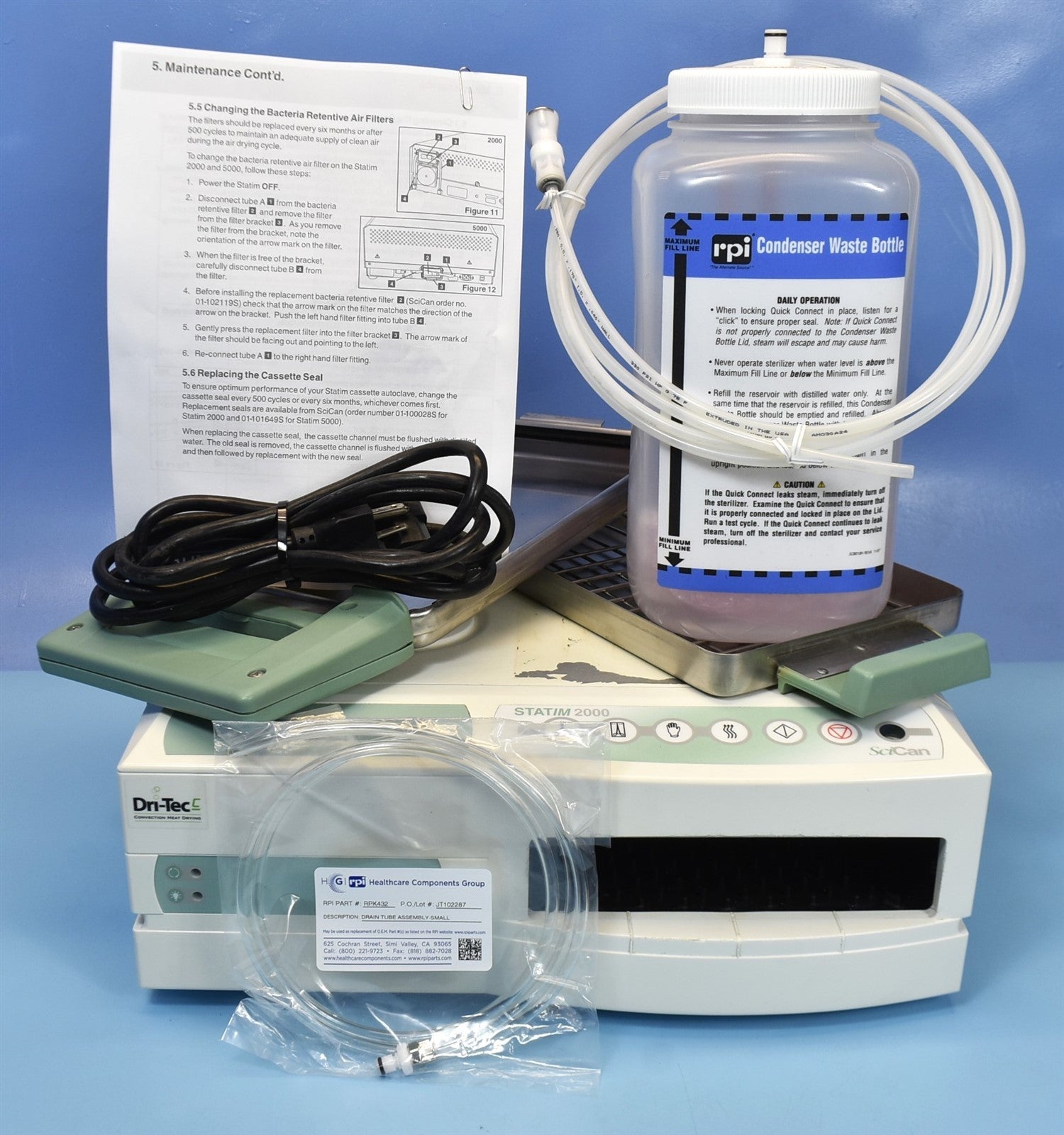 Your purchase will NOT include: This product is pre-owned and may not include the same accessories as a new, unused unit. - other accessories not shown or listed here. Model: STATIM 2000 Autoclave Manufacturer: SciCan Fast sterilization cycle for increased operatory efficiency Compact tabletop design ideal for dental offices Automatic drying cycle for ready-to-use instruments Digital control panel for simple operation and monitoring Reliable and durable construction for long-term use Maintenance reminders and safety features built-inThis autoclave was put through an initial functionality test, to prove that it does indeed work. Once it was proven to operate correctly, it was disassembled down to it's bare chassis and cleaned up, then reassembled. To insure it continued future operation, preventive maintenance parts were installed, which include, a new Water Pump, Air Valve, Check Valve, Safety Valve, Compressor Air Filter and Biological Filter. The Reservoir Tank was cleaned and flushed and a new Reservoir Cap, Reservoir Filter and Water Pump and Drain Kit Upgrade was installed. The sterilizing cassette was also cleaned and a new Cassette Seal was installed. Prior to running test cycles on this sterilizer, the temperature sensors were calibrated. Then this autoclave was tested through all it's preset sterilizing and drying cycles multiple times. To verify that this unit is achieving it's highest maximum required sterilization temperature, it was tested using a Max Register Thermometer and found to exceed 273 F while running a sterilization cycle.