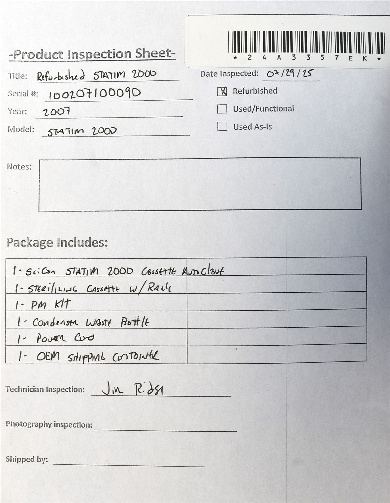 1 - SciCan STATIM 2000 Cassette Autoclave 1 - Sterilizing Cassette w/ Rack 1 - Condenser Waste Bottle 1 - Power Cord