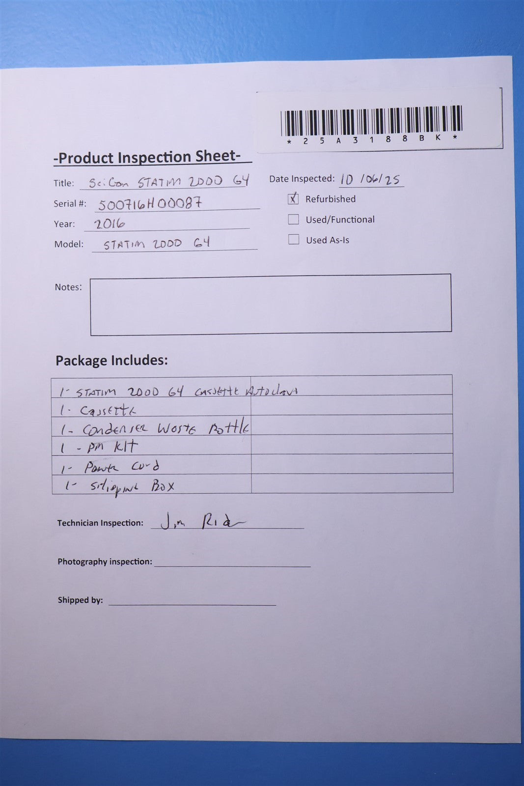 1 - SciCan STATIM 2000 G4 Cassette Autoclave 1 - Sterilizing Cassette w/ Rack 1 - Condenser Waste Bottle 1 - PM KIT 1 - Power Cord 1 - Shipping Container