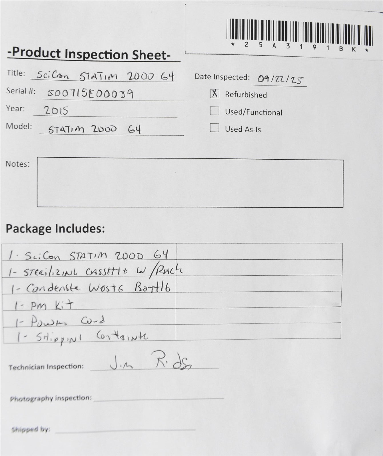 1 - SciCan STATIM 2000 G4 Cassette Autoclave 1 - Sterilizing Cassette w/ Rack 1 - Condenser Waste Bottle 1 - PM KIT 1 - Power Cord 1 - OEM Shipping Container