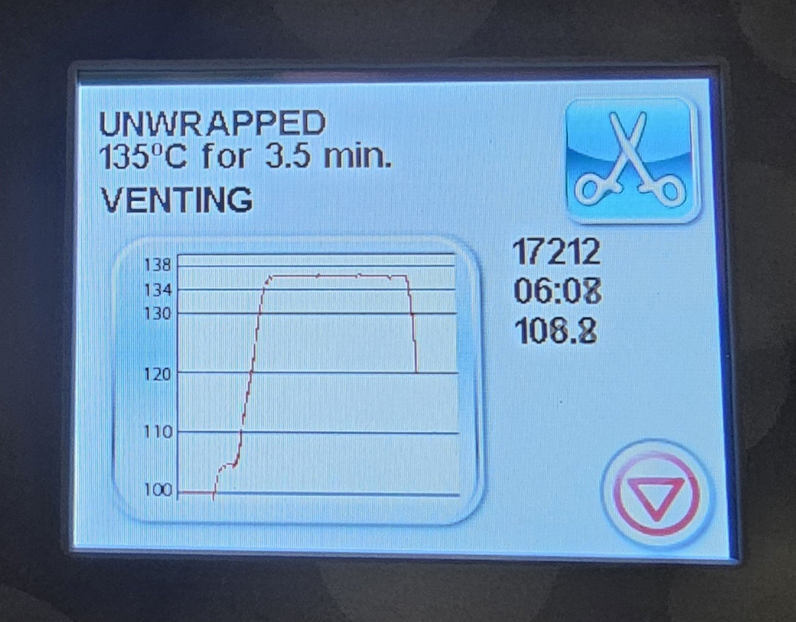 This autoclave was put through an initial functionality test, to prove that it does indeed work. Once it was proven to operate correctly, it was then connected to the internet via an ethernet connection, and a new feature update was successfully installed. Then this sterilizer was disassembled down to it's bare chassis, cleaned, refurbished and reassembled. As part of this autoclaves refurbishment, preventive maintenance parts were installed, which include, a new Water Pump, Air Valve, Check Valve, Biological Filter and Compressor Air Filter. The Reservoir Tank was cleaned and flushed and a new Reservoir Filter and Water Pump Filter were installed. A new Touch Pad Display was also installed. The sterilizing cassette was also cleaned and a new Cassette Seal was installed. Prior to running test cycles on this sterilizer, the temperature sensors were calibrated. Then this autoclave was tested through all it's preset sterilizing and drying cycles multiple times. To verify that this unit is achieving it's highest maximum required sterilization temperature, it was tested using a Max Register Thermometer and found to exceed 273 F while running a sterilization cycle.