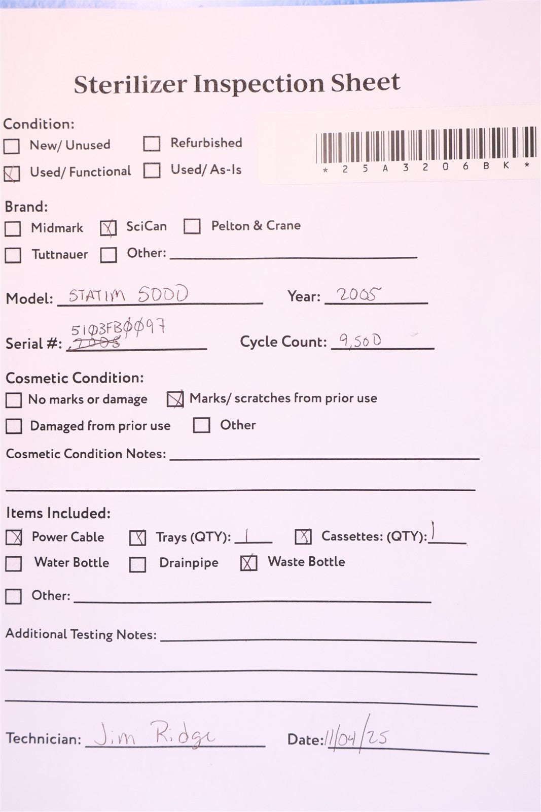 1 - SciCan STATIM 5000 Cassette Autoclave 1 - Sterilizing Cassette w/ Rack 1 - Condenser Waste Bottle 1 - Power Cord 1 - Shipping Box