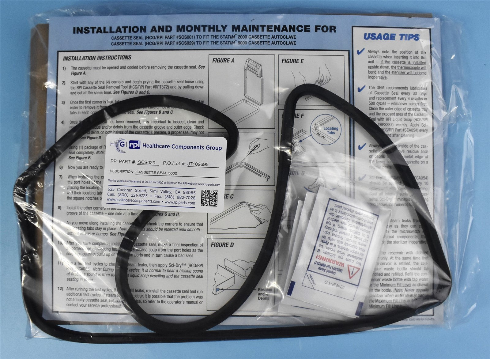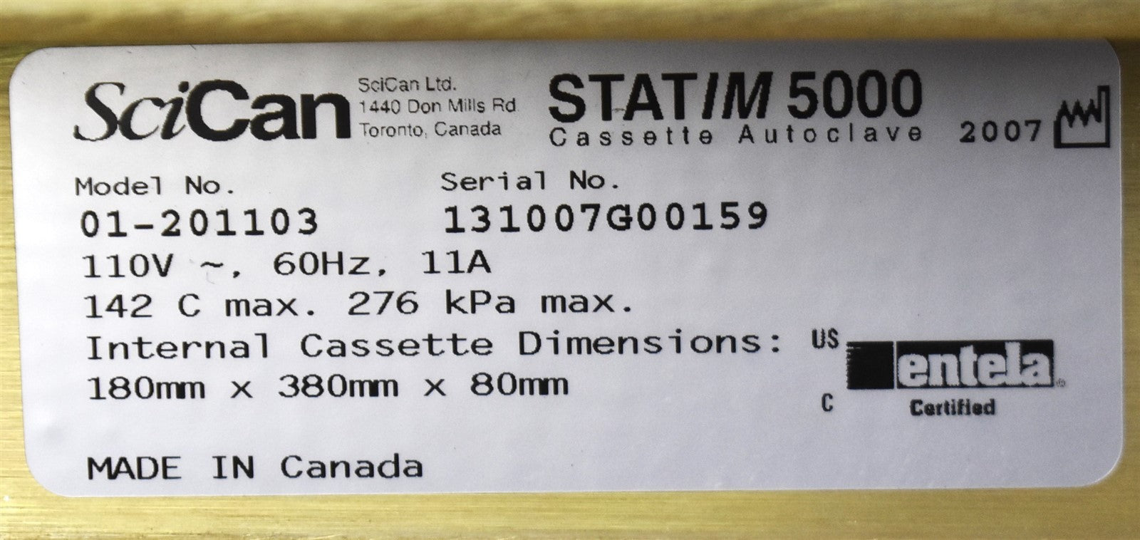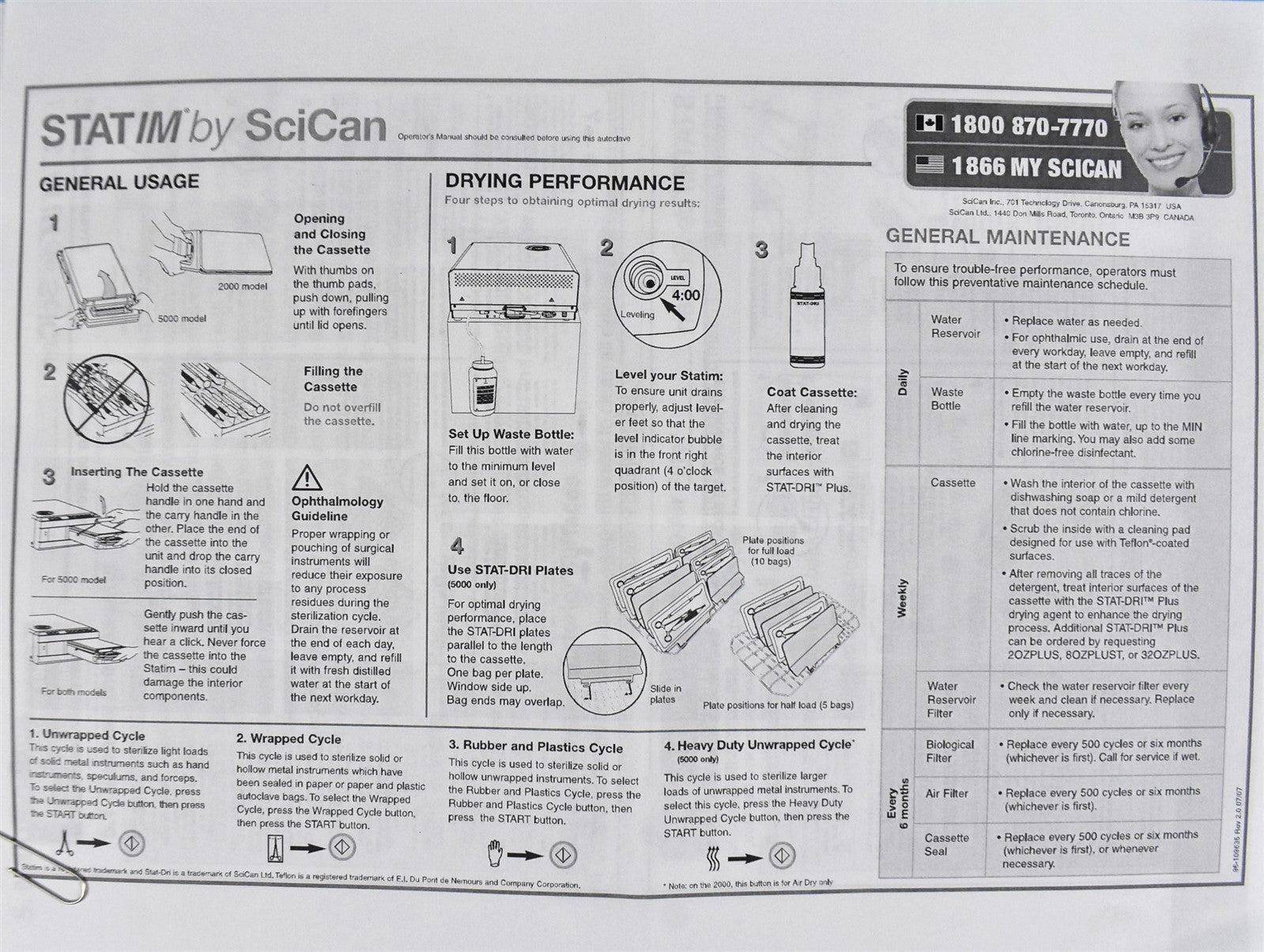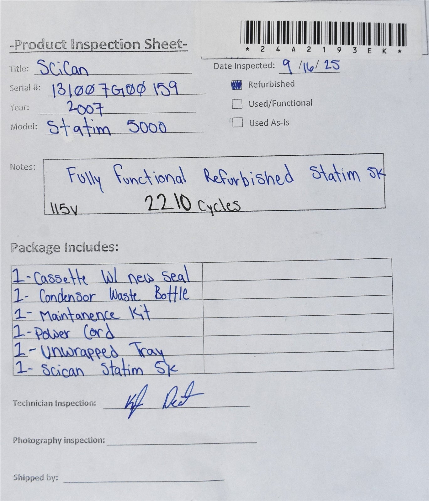 1- Cassette with new seal, 1- Condensor waste bottle, 1- Power Cord, 1- Unwrapped sterilizer Tray, 1- Maintenance Kit, 1- Scican Statim 5000 Cassette Sterilizer.