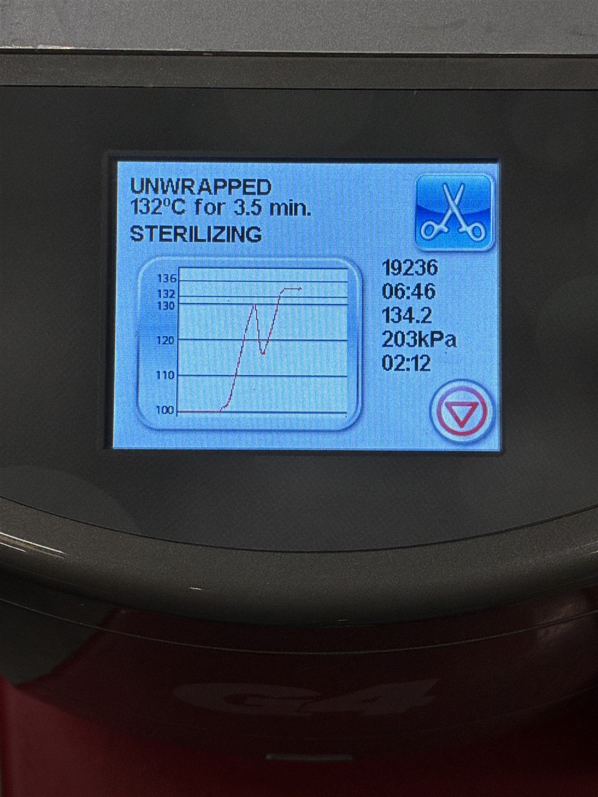 This autoclave is a 2012 model with 19,250 cycles run in it. This autoclave was put through an initial functionality test, to prove that it does indeed work. It was connected to the internet via it's built in ethernet connection and no new updates were found for it. Then it was disassembled down to it's bare chassis and cleaned up, then reassembled. To insure it continued future operation, preventive maintenance parts were installed, which include, a new Water Pump, Air Valve, Check Valve, Safety Valve, Compressor Air Filter and Biological Filter. The Reservoir Tank was cleaned and flushed and a new Water Pump Filter and Drain Kit Upgrade was installed. The sterilizing cassette was also cleaned and a new Cassette Seal was installed. Prior to running test cycles on this sterilizer, the temperature sensors were calibrated. Then this autoclave was tested through all it's preset sterilizing and drying cycles multiple times. To verify that this unit is achieving it's highest maximum required sterilization temperature, it was tested using a Max Register Thermometer and found to exceed 273 F while running a sterilization cycle.