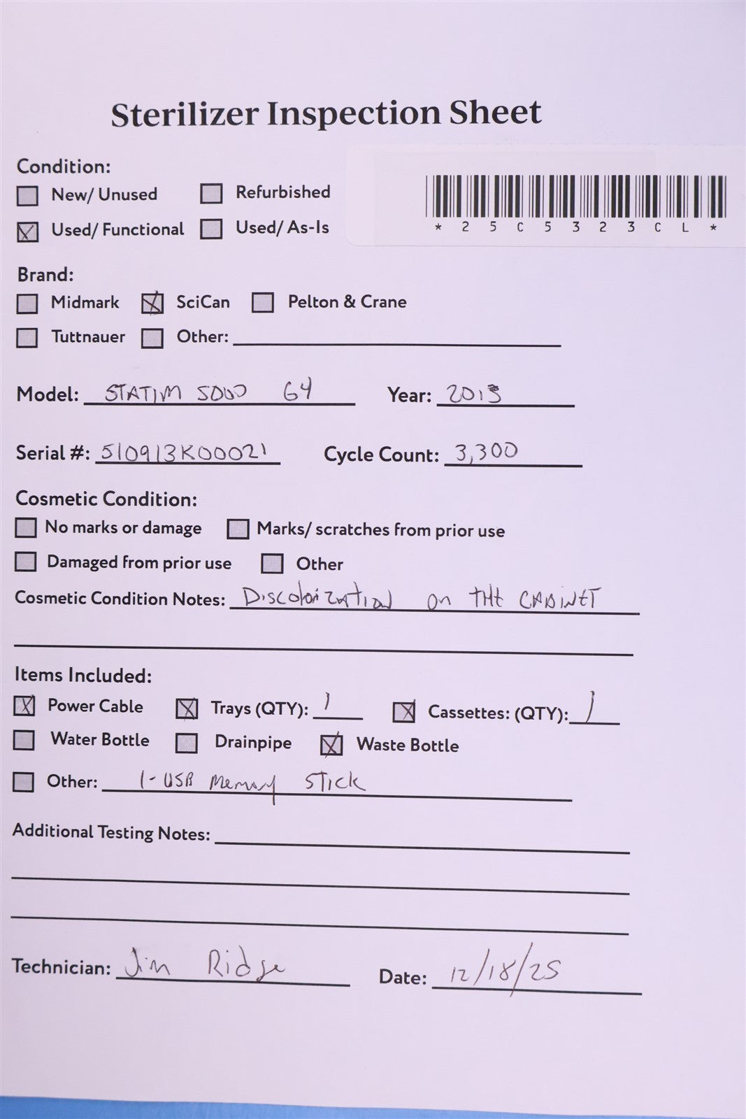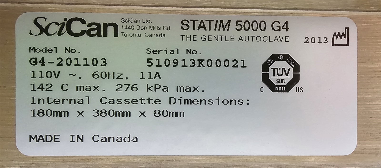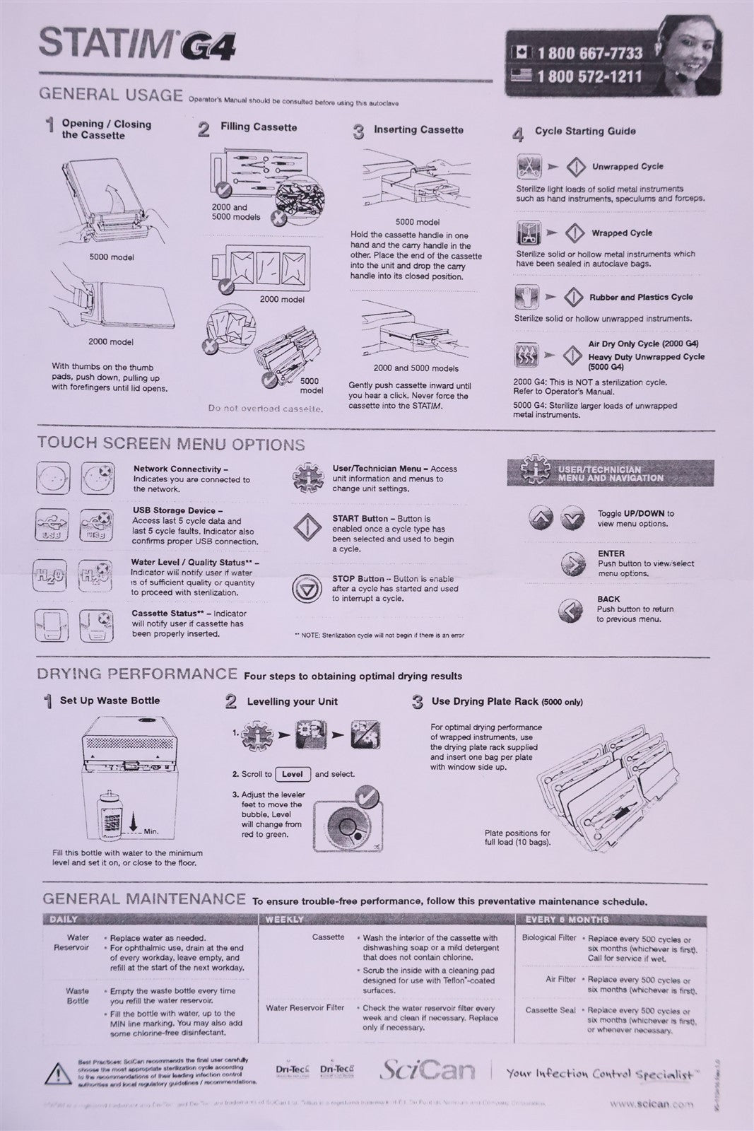 1 - SciCan STATIM 5000 G4 Cassette Autoclave 1 - Sterilizing Cassette w/ Rack 1 - USB Memory Stick 1 - Condenser Waste Bottle 1 - Power Cord