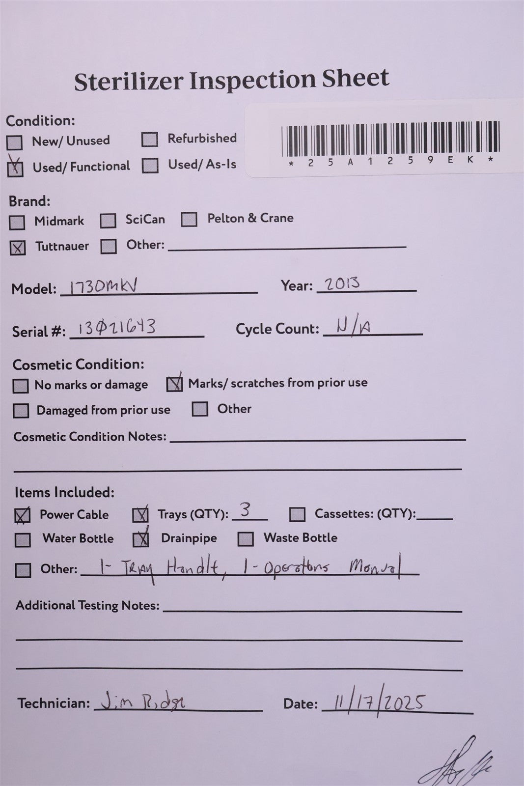 1 - Tuttnauer 1730MKV ValueKlave Manual Autoclave - Steam Sterilizer 3 - Sterilizing Trays w/ Rack 1 - Drain Hose 1 - Sterilizer Tray Handle 1 - Power Cord