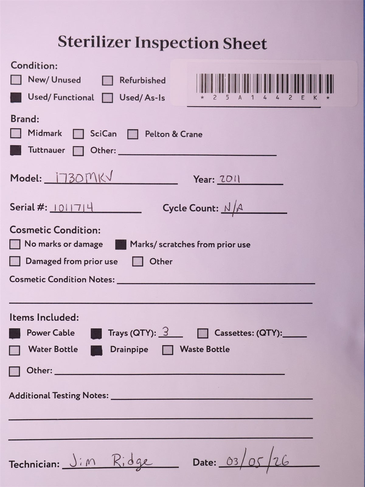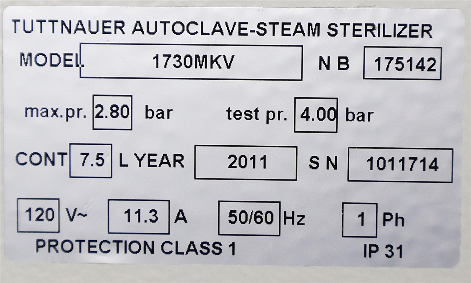 Your purchase will NOT include: This product is pre-owned and may not include the same accessories as a new, unused unit. - other accessories not shown or listed here.This Autoclave is a 2011 model with an unknown number of cycles run in it. Prior to testing this autoclave, the major components were inspected and tested and found to be functioning normally. Then the Reservoir Tank was cleaned and flushed and a new Safety Valve, Condenser Coil, Air Jet Valve and Reservoir Cap were installed. Cleaned the sterilizing chamber and installed a new Door Gasket and Door Bellows Assembly. Also installed a new Power Switch. Cleaned the sterilizing trays and rack. To test this autoclave, it was first connected to a 120 volt power source, distilled water was added, it was then properly levelled as per it's chamber size requirement and then testing began. This sterilizer was run through cycles of 270 F for 10 minutes and 250 for 30 minutes several times. To verify that this autoclave is achieving it's maximum required sterilizing temperature during a cycle, it was temperature tested with the use of a Max Register Thermometer, and found to exceed 270 F during a sterilization cycle.