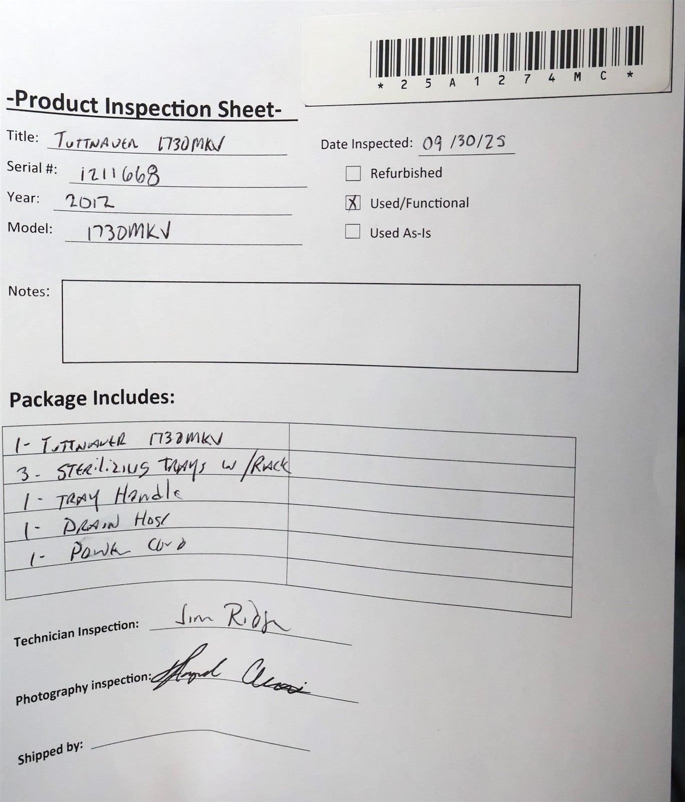 1 - Tuttnauer 1730MKV ValueKlave 3 - Sterilizing Trays w/ Rack 1 - Drain Hose 1 - Tray Handle 1 - Power Cord