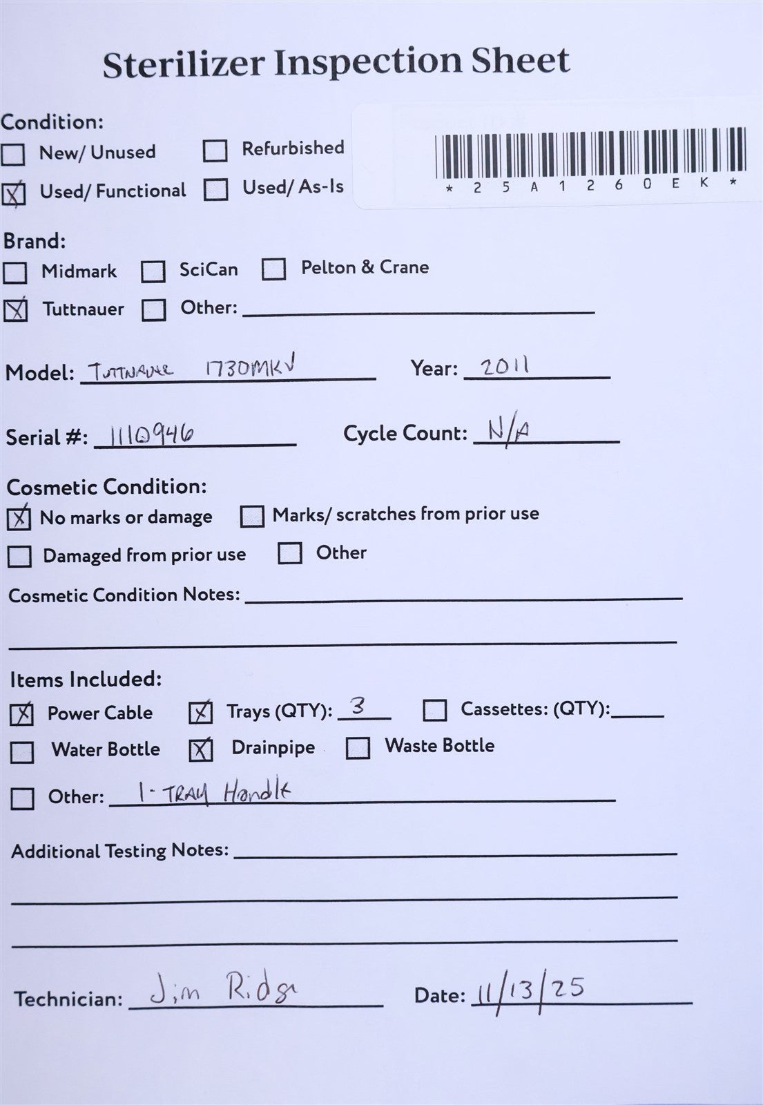 1 - Tuttnauer 1730MKV ValueKlave Manual Autoclave-Steam Sterilizer 3 - Sterilizing Trays w/ Rack 1 - Tray Handle 1 - Drain Hose 1 - Power Cord