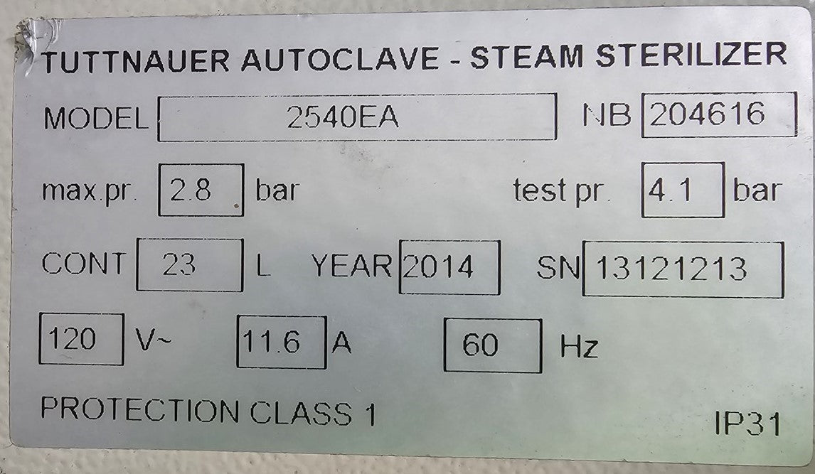 This autoclave is a 2014 model with less than 3,900 cycles run on it. Prior to testing this autoclave, the major components were inspected and tested and any issues that were found were repaired during the inspection. As part of the preventive maintenance practices for this type of Tuttnauer, the Reservoir Tank was cleaned and flushed and a new Safety Valve, Air Jet Valve and Reservoir Cap were installed. Installed a new Door Switch, Door Bellows Assembly and Door Seal. Installed a new Display Panel and Power Switch. Cleaned the Sterilizing Trays and Rack. To test this autoclave, it was first connected to a 120 volt power source, distilled water was added, it was then properly levelled as per it's chamber size requirement and then testing began. This sterilizer was run through all it's preset sterilizing and drying cycles several times. To verify that this autoclave is achieving it's maximum required sterilizing temperature during a cycle, it was temperature tested with the use of a Max Register Thermometer, and found to exceed 270 F during a sterilization cycle