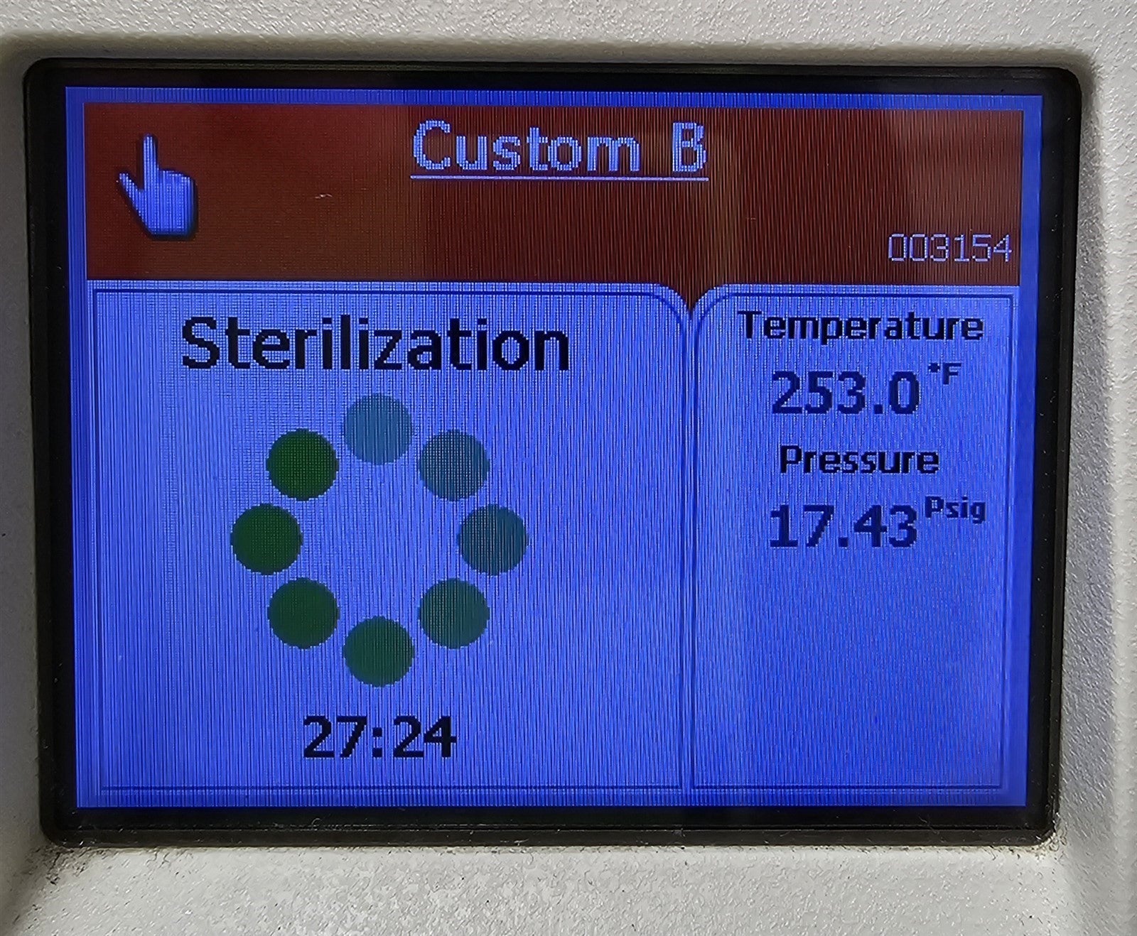 Prior to testing this autoclave, the Reservoir Tank was cleaned and flushed and a new Safety Valve was installed. Also a new Air Drying Filter and Cap were installed. Cleaned the sterilizing trays and rack. Before this autoclave was run through it's preset cycles, the pressure and temperature sensors were calibrated. Then to test this autoclave, it was connected to a 120 volt power source, distilled water was added, then it was run through all it's sterilizing and drying cycles several times. To ensure that this autoclave is achieving it's maximum required sterilizing temperature during a cycle, it was temperature tested using a Max Register Thermometer and found to exceed 273 F during a cycle.