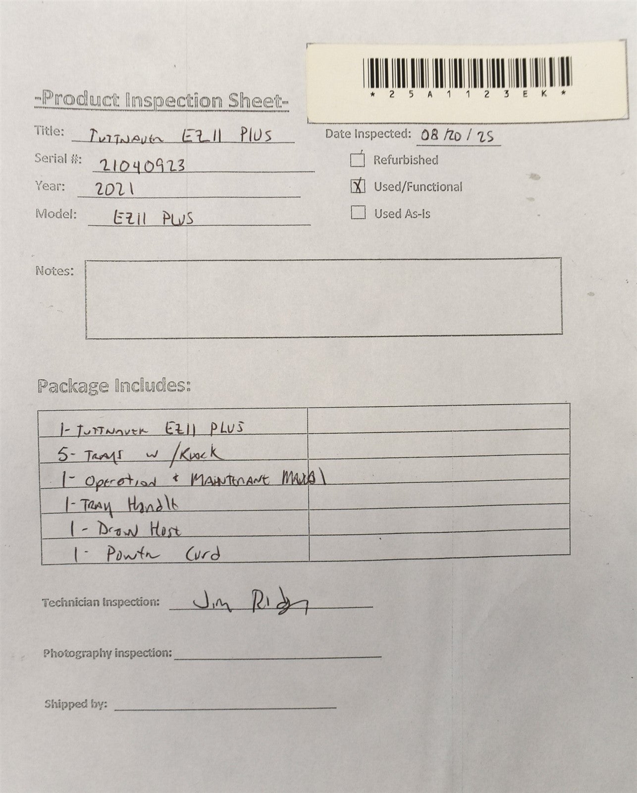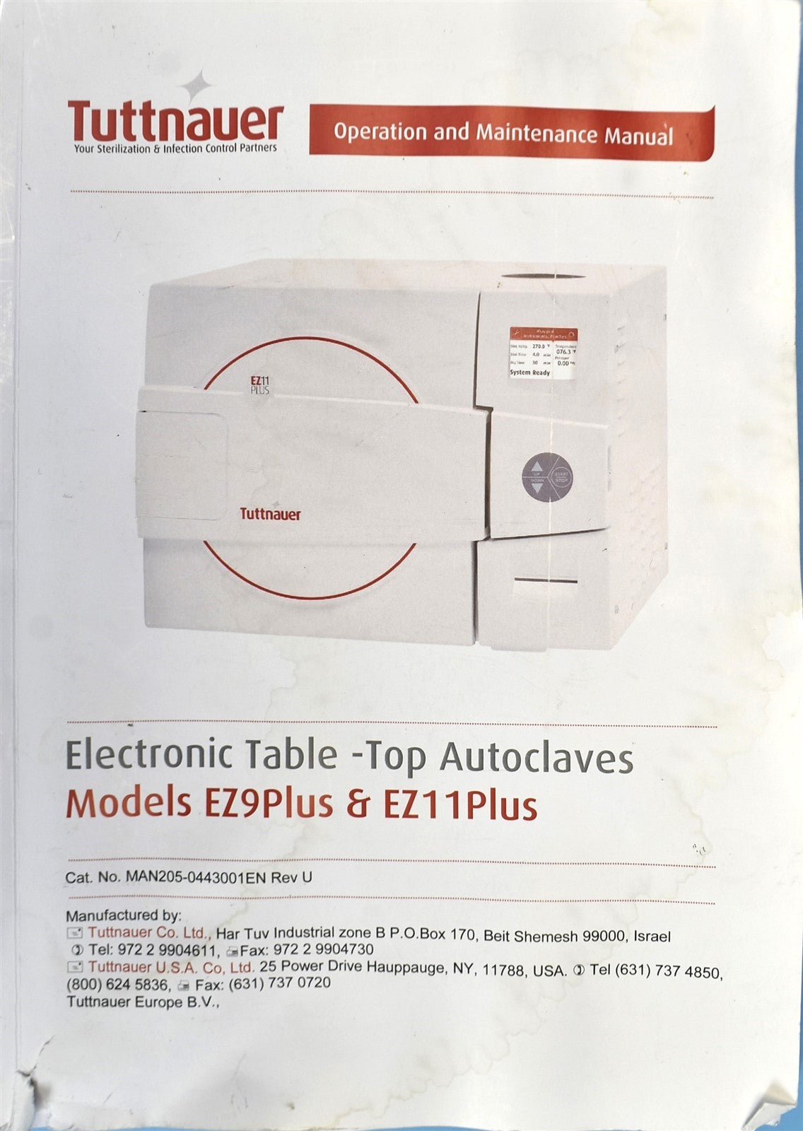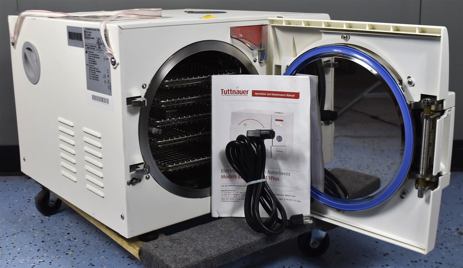 1 - Tuttnauer EZ11PLUS Autoclave Steam Sterilizer 5 - Mesh Sterilizing Trays w/ Rack 1 - Tray Handle 1 - Drain Hose 1 - Power Cord 1 - Operations and Maintenance Manual