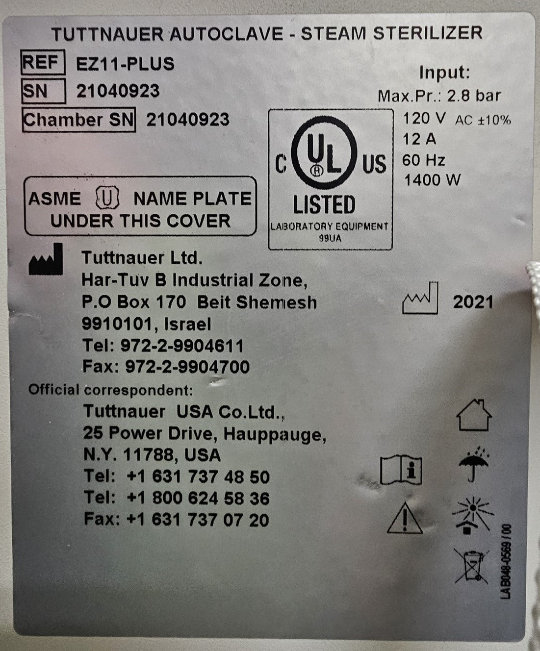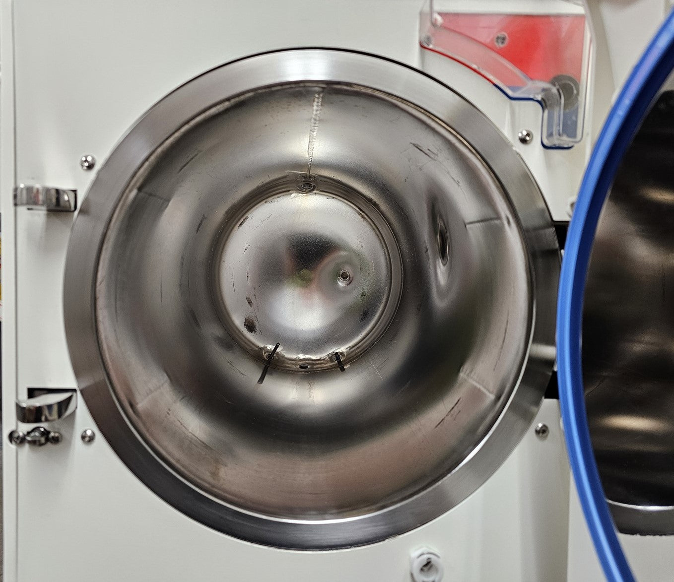 Your purchase will NOT include: This product is pre-owned and may not include the same accessories as a new, unused unit. - other accessories not shown or listed here. Chamber Size: 11" x 19.8" for larger loads Touch Display: User-friendly control panel with real-time cycle data Automatic Cycles: Pre-programmed sterilization programs for ease of use Closed Door Drying: HEPA filter maintains sterility during drying USB Port: Easy cycle data transfer for record keeping Efficient Design: Quick cycles with reduced water consumption Year: 2021 model, modern features and updated technologyPrior to testing this autoclave, the Reservoir Tank was cleaned and flushed and a new Safety Valve was installed. Also a new Air Drying Filter and Cap were installed. Cleaned the sterilizing trays and rack. Before this autoclave was run through it's preset cycles, the pressure and temperature sensors were calibrated. Then to test this autoclave, it was connected to a 120 volt power source, distilled water was added, then it was run through all it's sterilizing and drying cycles several times. To ensure that this autoclave is achieving it's maximum required sterilizing temperature during a cycle, it was temperature tested using a Max Register Thermometer and found to exceed 273 F during a cycle.